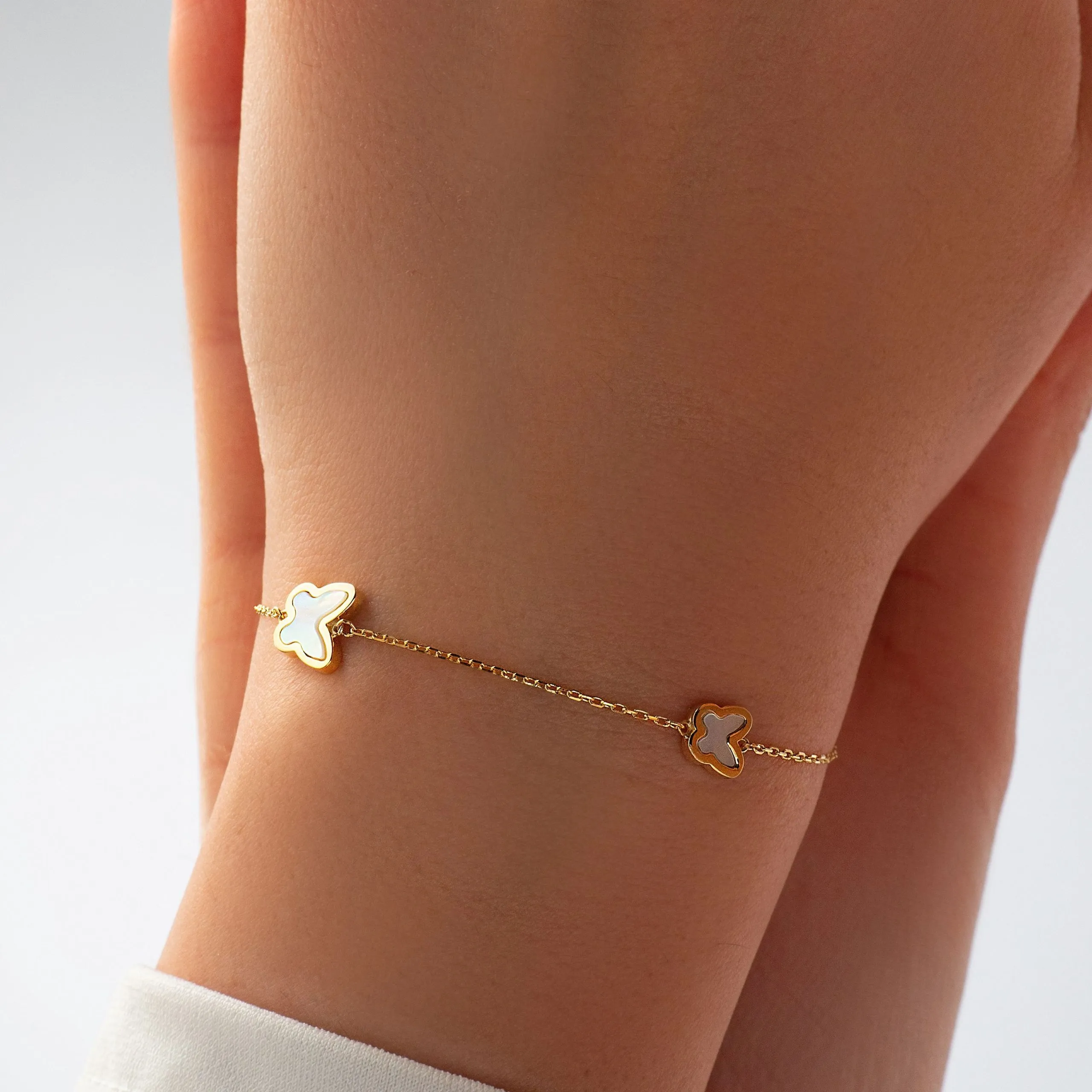 Poklonite sebi ili Vama dragoj osobi elegantnu Blue Eye narukvicu. Izrađena je od 14 kt žutog zlata, ukrašena s tri privjeska u obliku leptira koji su ispunjeni sedefom. Zablistajte već danas.