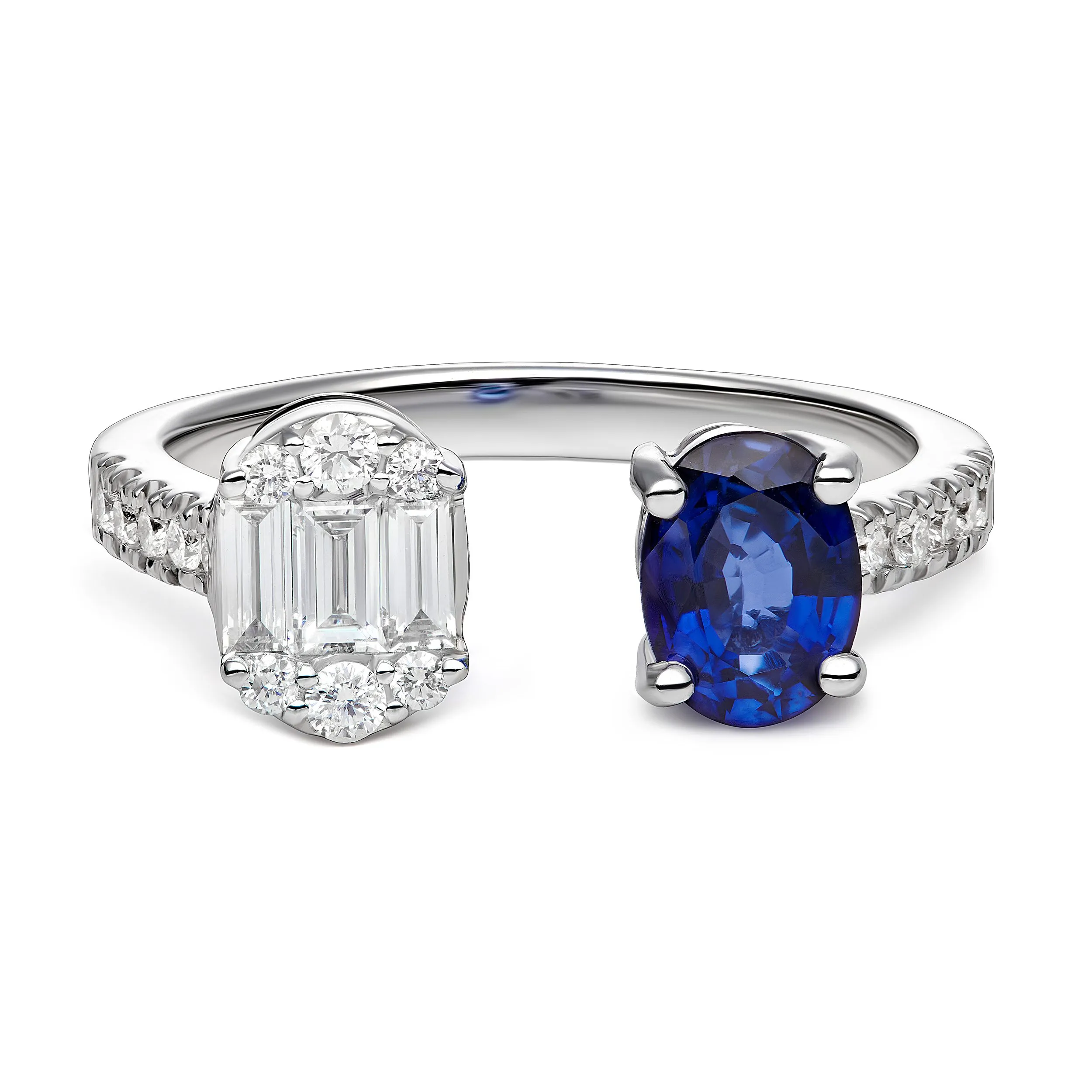 Celestial Duo zlatni prsten sa safirom i dijamantima izrađen od 18kt bijelog zlata. Ovaj predivan prsten spoj je dva blistava kamena – plavog safira i dijamanata. Bijelo zlato savršeno ističe ljepotu ovih dragocjenih kamena, dodajući modernu notu ovom jedinstvenom dizajnu. Idealno za posebne trenutke, ovaj prsten simbolizira ljubav, vjernost i eleganciju, te će zasjati na prstu svake osobe koja ga nosi.