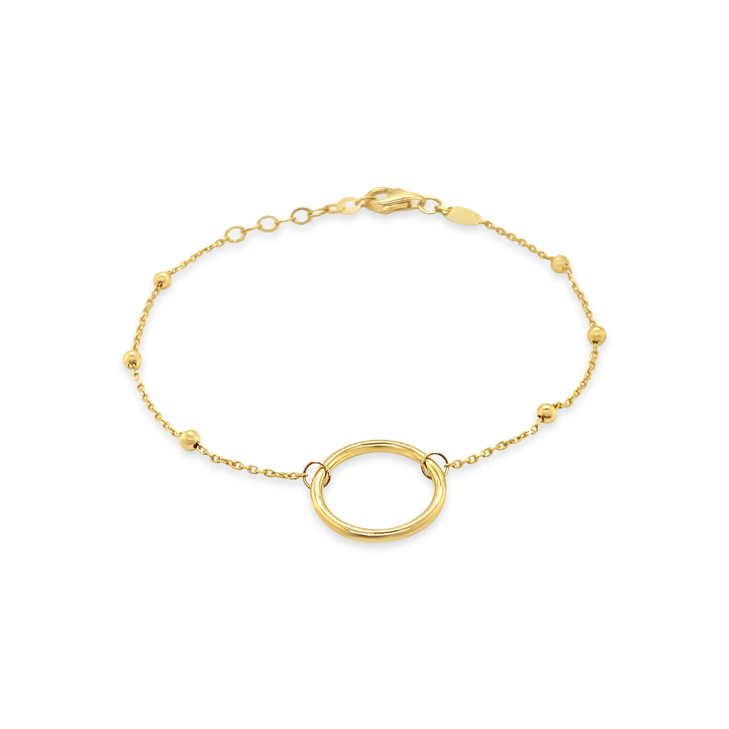 Zlatna narukvica izrađena od 14kt žutog zlata, dužine 19 cm s decentnim perfektno raspoređenim kuglicama u nizu, koje savršeno nadopunjuju centralni privjesak kruga. Narukvica se uklapa u sve stilove, idealne za dnevni ili večernji izlazak. Razveselite sebe ili Vama dragu osobu i naručite već danas s dostavom na kućnu adresu.