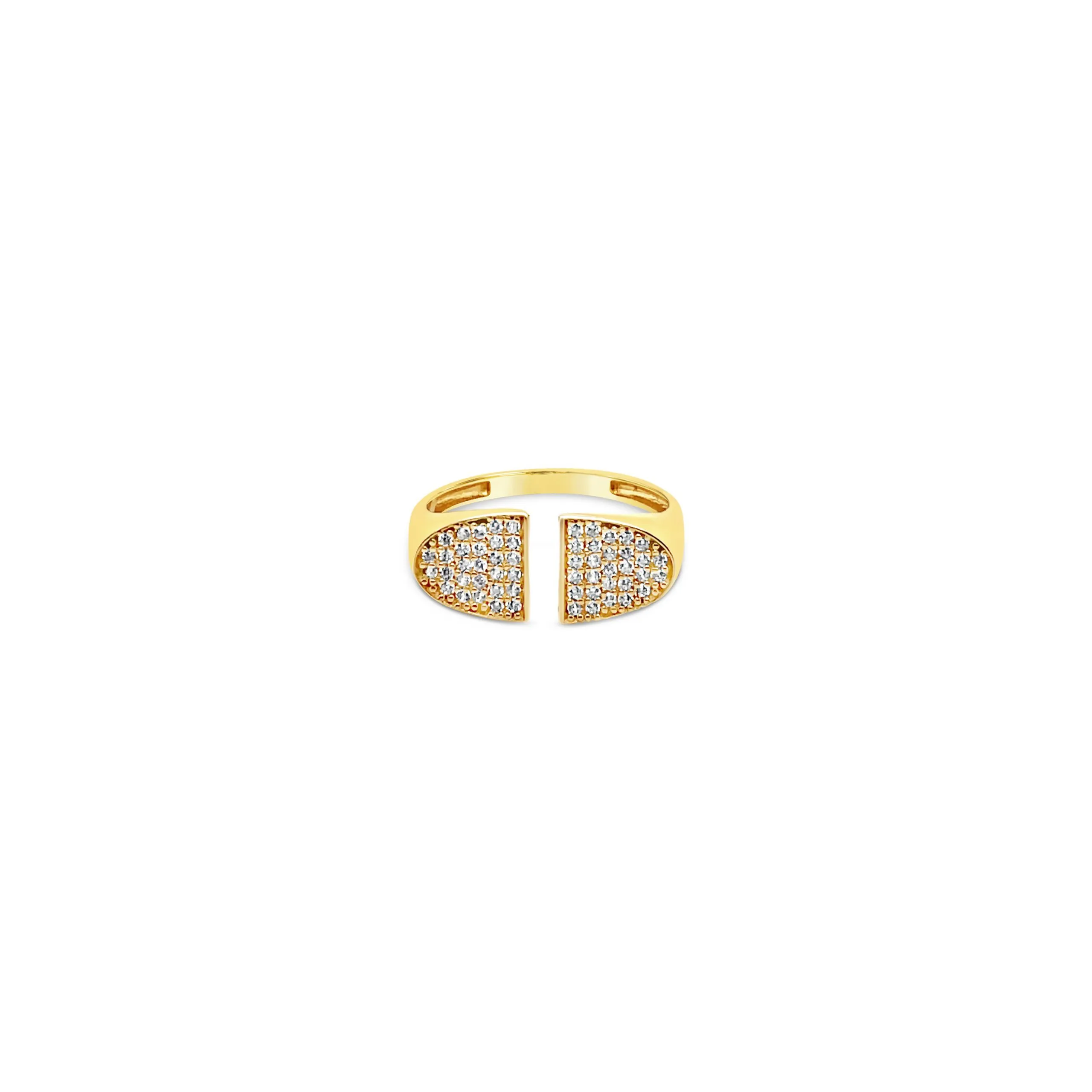 Compatible zlatni prsten izrađen je od 14 kt žutog zlata. Izgledom podsječa na pečat. Ukrašen je nizom cirkona. Pokažite odvažnost i podignite svoj look ovim bogatim prstenom.