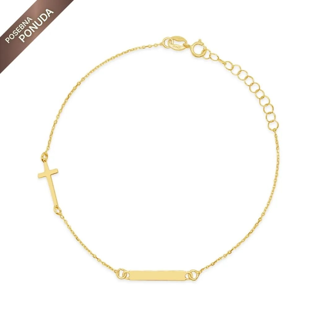 Jedinstvena narukvica s temom križa izrađena od 14kt žutog zlata dužine 17+3cm savršen je poklon za Vašu ženu, djevojku ili kćerku. Možete proslaviti i druge posebne prilike kao Prve pričesti, Krizme ili prijateljstvo te na tvrdom privjesku ugravirati specijalnu posvetu. Naručite već danas s dostavom na kućnu adresu.
