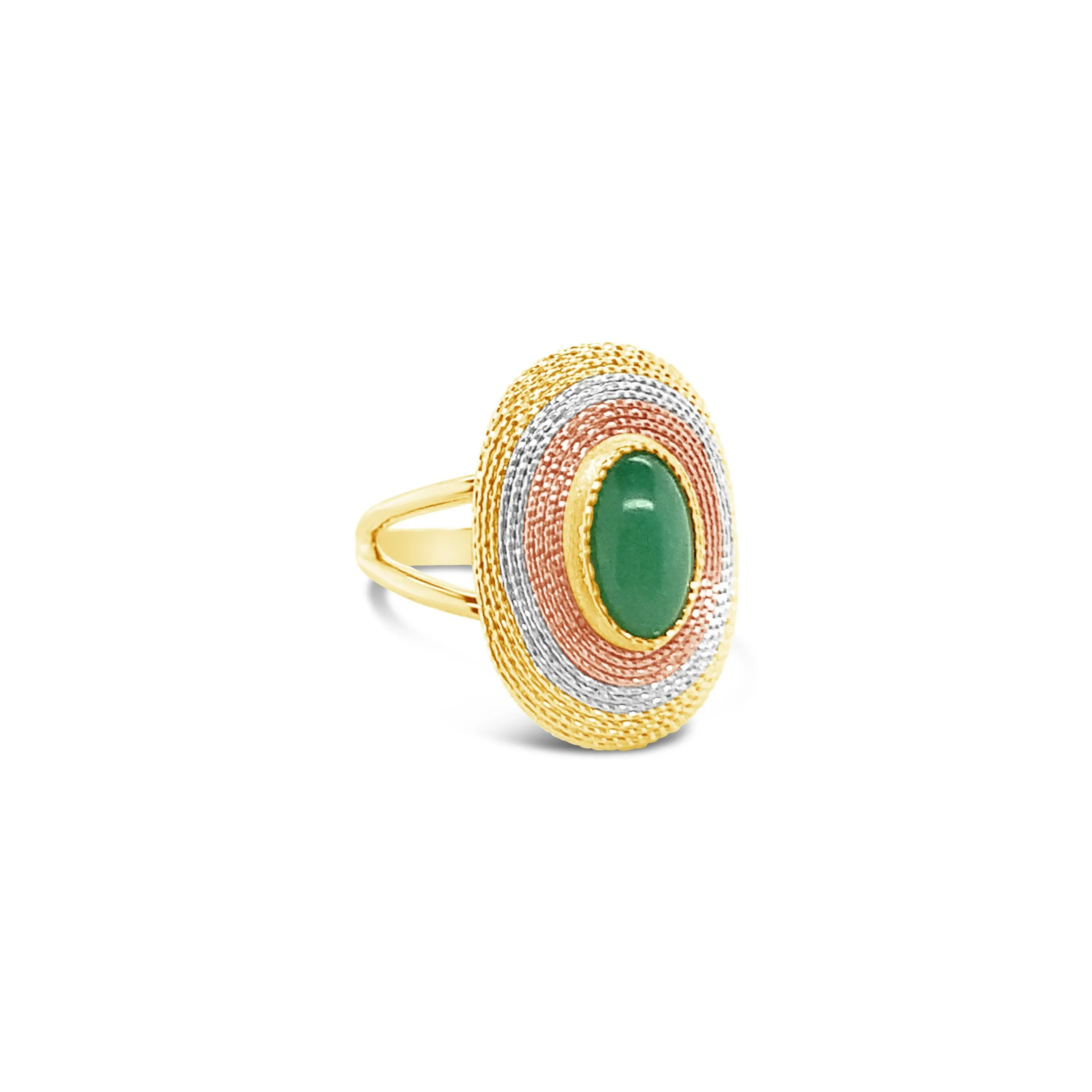 Razigrani model prstena s upečatljivim kamenom u smaragdno zelenoj boji. Idealan je detalj, a može se nositi svaki dan. Veličina prstena je 14,5mm x 20,5mm, a izrađen je od 14 kt žutog zlata. Razveselite se već danas s dostavom na kućnu adresu.
