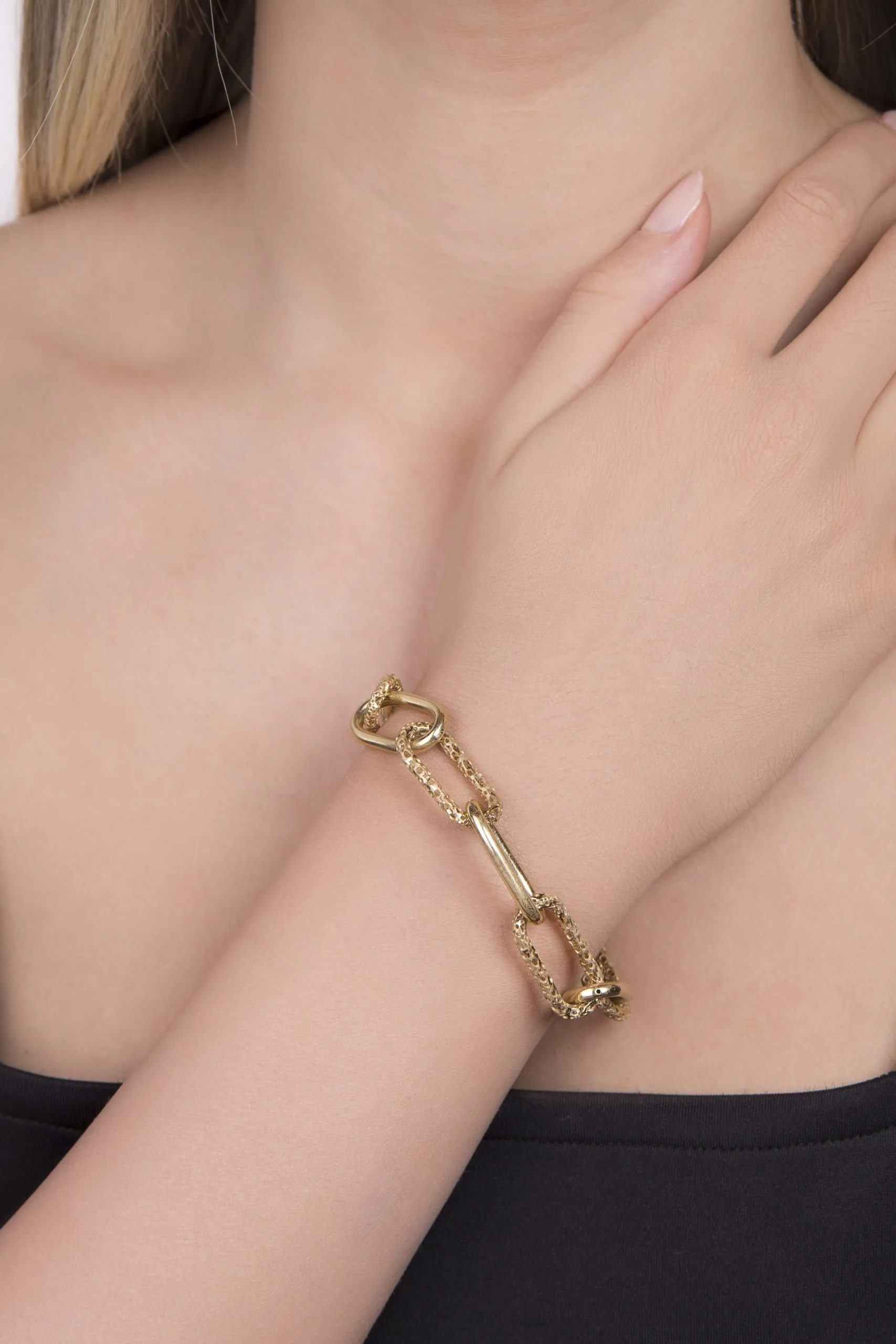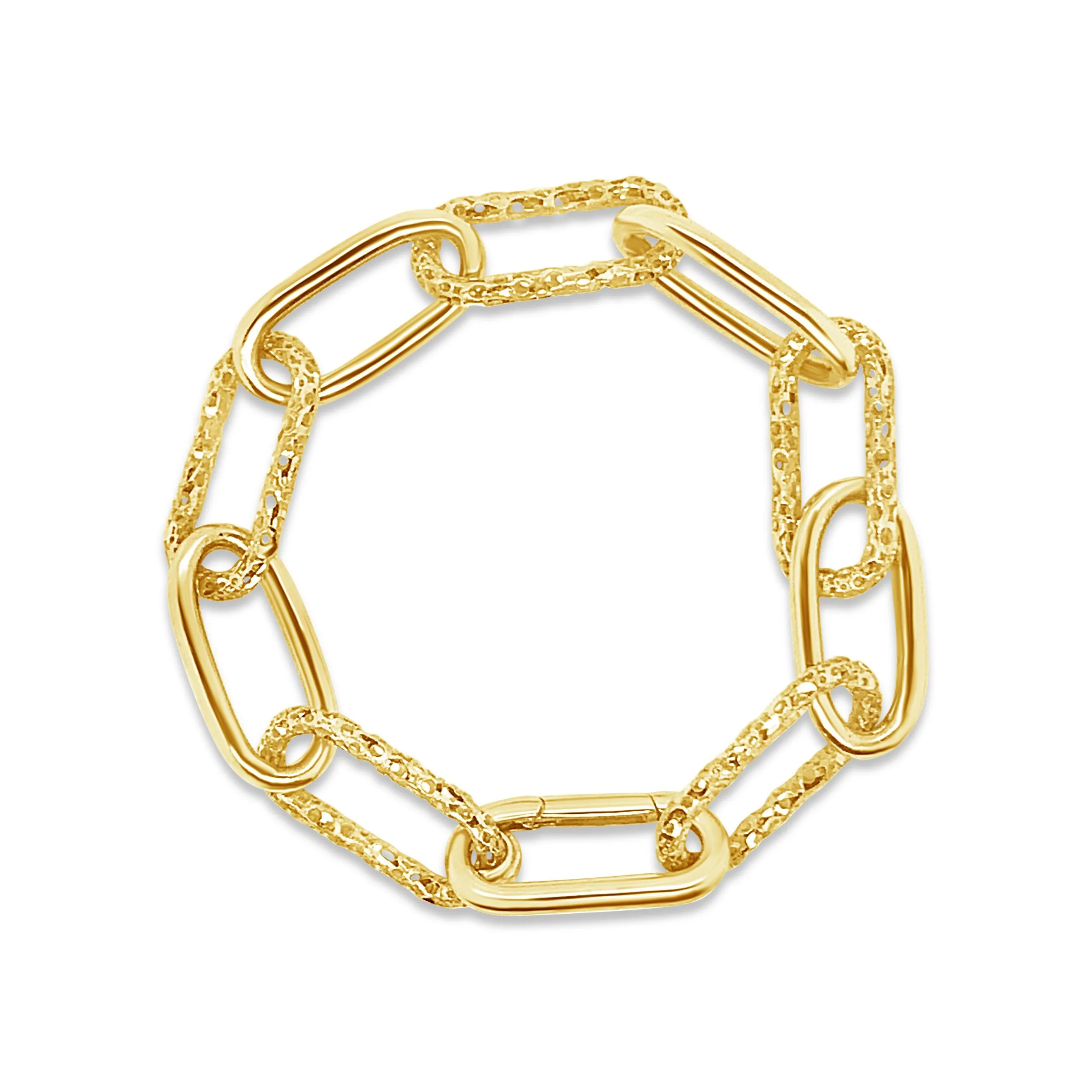 Isprepletene zlatne karike ovalnog oblika za jednostavan i profinjen look. Žuto 14 kt zlato u čvrstoj strukturi dimenzije 21 cm. Ostavi profinjeni dojam i naruči već danas s dostavom na kućnu adresu.