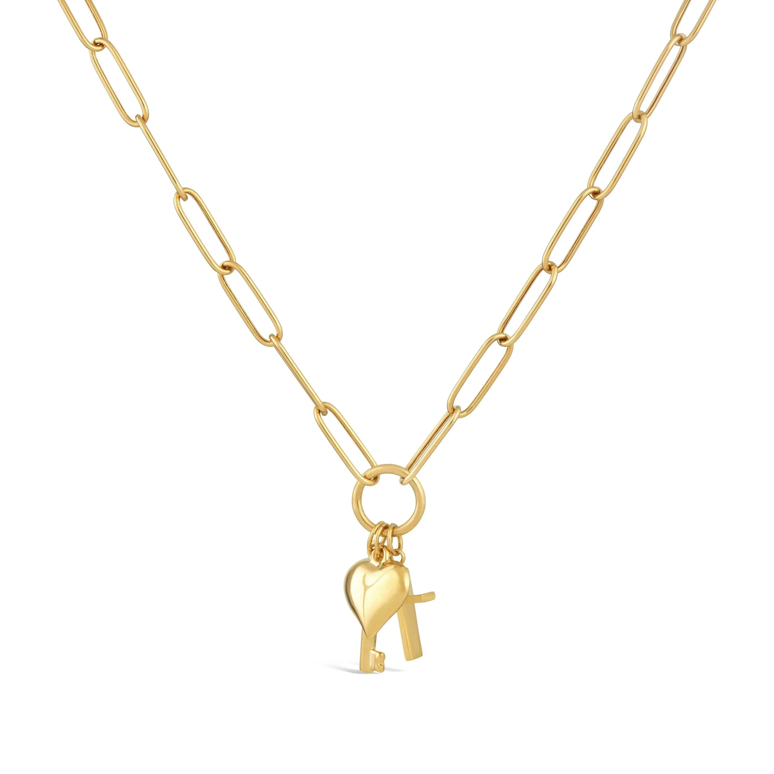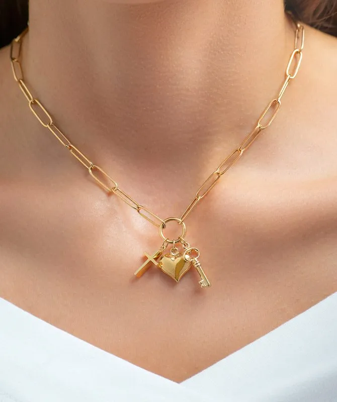 Fides zlatna ogrlica vizualna je priča o vjeri, ljubavi i vječnom pečatu, predstavljena simboličkim privjescima – križem, srcem i ključem. Inovativnost ovog lančića leži u načinu na koji su ovi simboli integrirani, stvarajući skladan i, njenom nositelju, vrlo osoban doživljaj. Fides ogrlica, duljine 45 cm, izrađena je od 14kt žutog zlata. Veličina privjesaka je 1 cm.