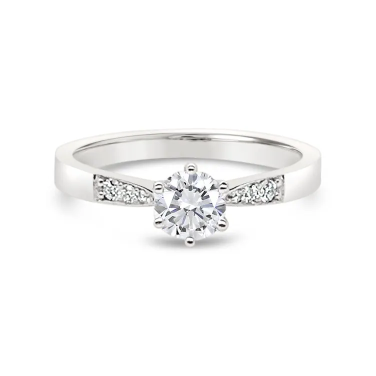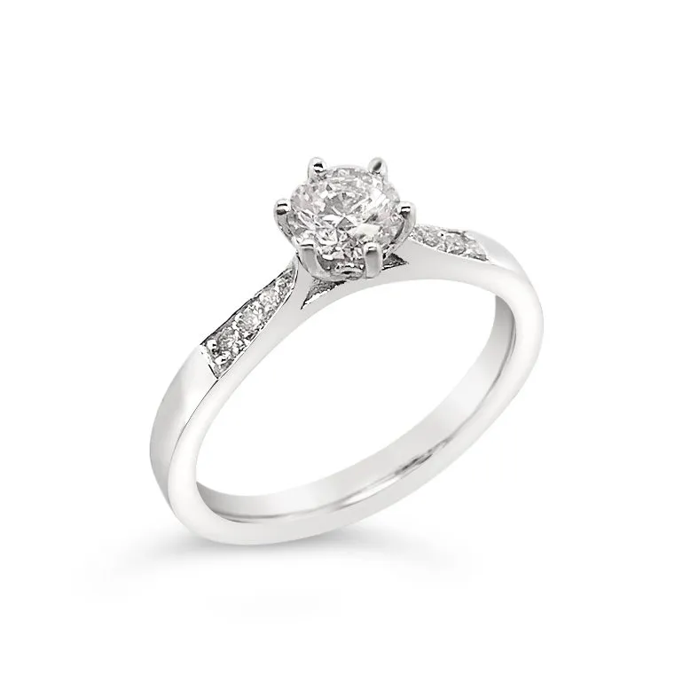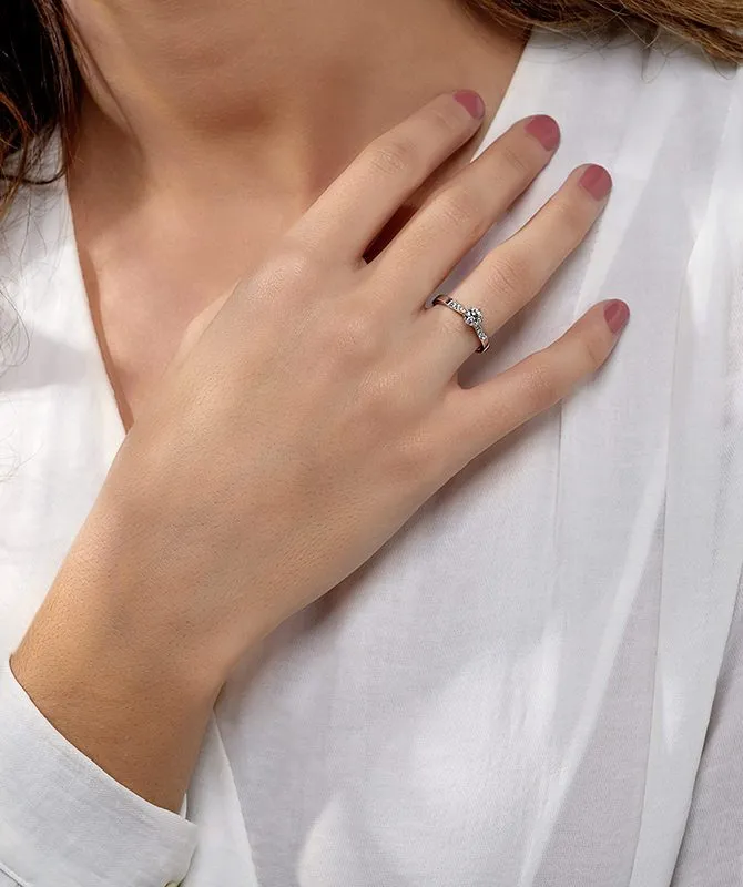 Glamurozni dijamantni prsten izrađen od 18kt bijelog zlata na centralnom dijelu osvaja na prvi pogled s dijamantnim kamenom dimenzije 0,42ct. Teksturu prstena krase sitni dijamanti uz centralni dio, bogato grupirani u dimenzijama 0,07ct. Naručite već danas svoju dozu glamura s dostavom na kućnu adresu!