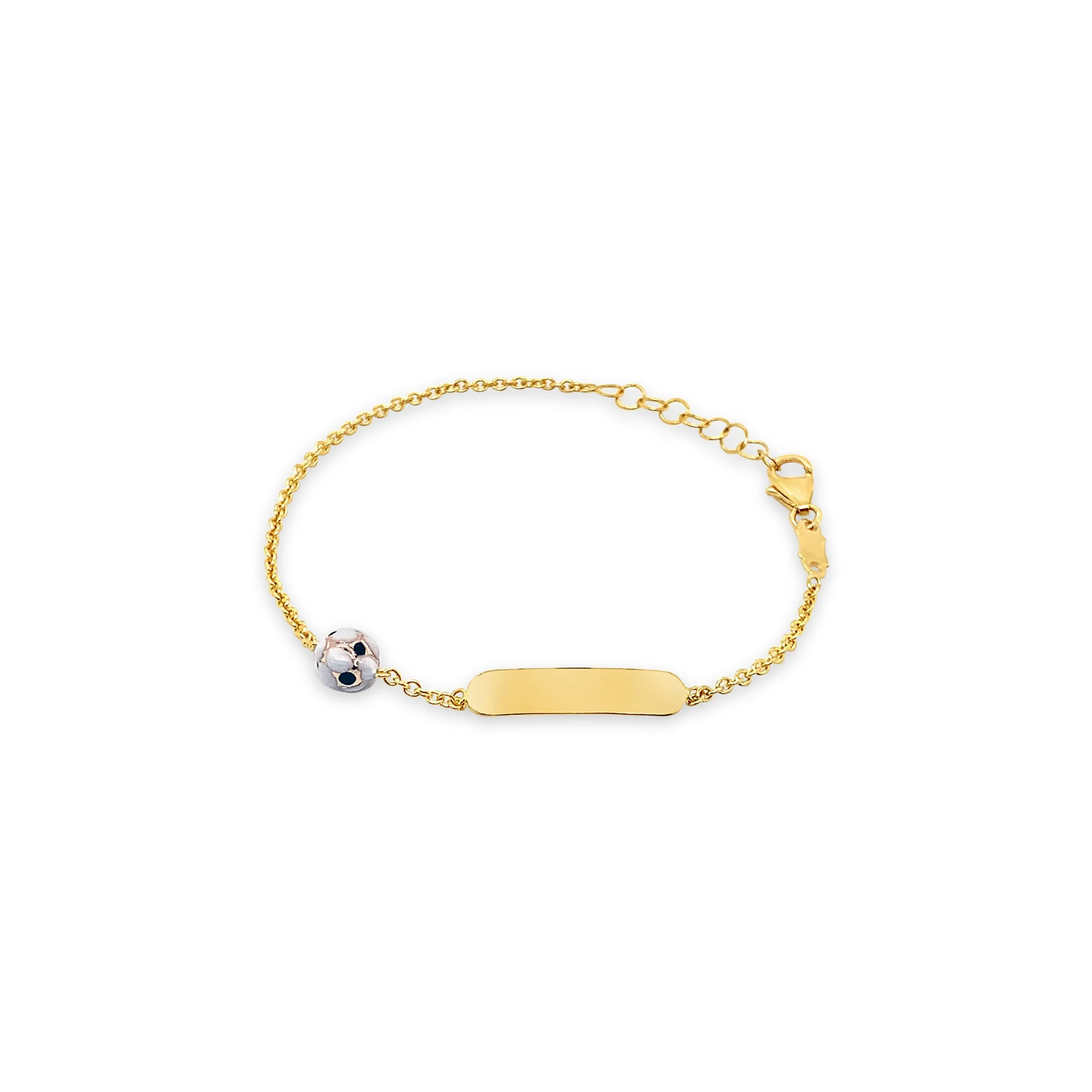 Za sve istinske ljubitelje nogometa. Dječja zlatna narukvica dizajnirana od 14kt žutog zlata, koju na čvrstom nizu sitnih karika krasi nogometna lopta za sve vatrene navijače. Čvrsta pločica idealna je za graviranje posebne poruke koja će upotpuniti ljubav prema nogometu. Dostava na kućnu adresu.