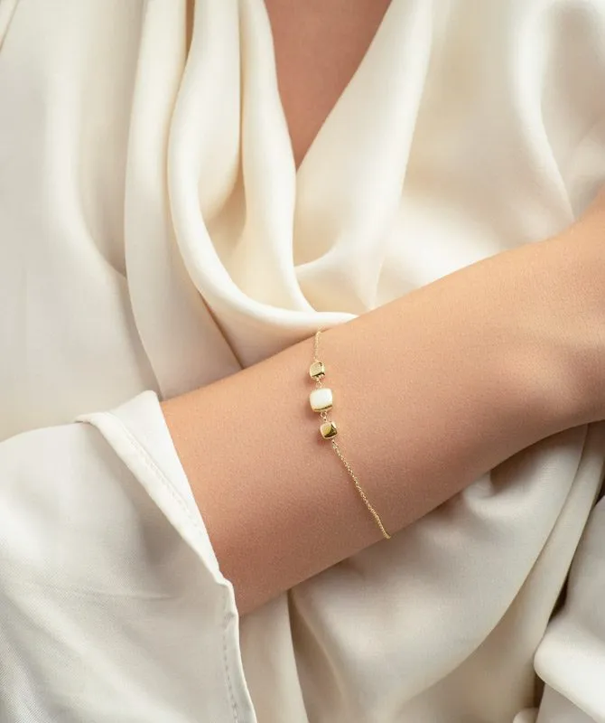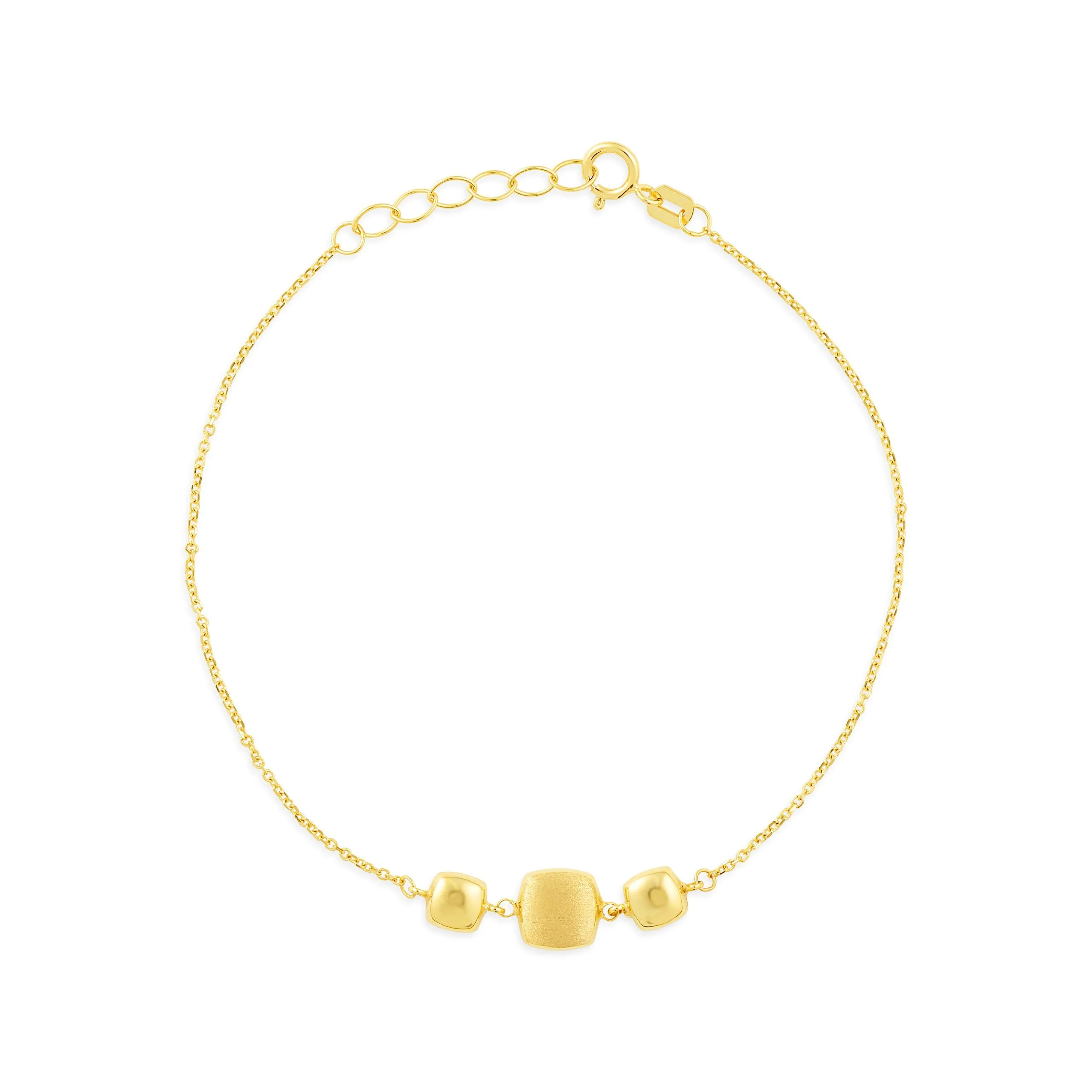 Forum zlatna narukvica elegantna je ženska narukvica izrađena od 14 kt žutog zlata. Jednostavnost ove narukvice upotpunjuju dva manja i jedan veći motiv kocke koji stoje na mjestu sitnih, okruglih karika. Forum zlatna narukvica duga je 17 cm, uz mogućnost produljenja za 2 cm. Ovu narukvicu možete kombinirati uz istoimenu ogrlicu, a naručiti ih možete putem web shopa Zlatarne Dodić.
