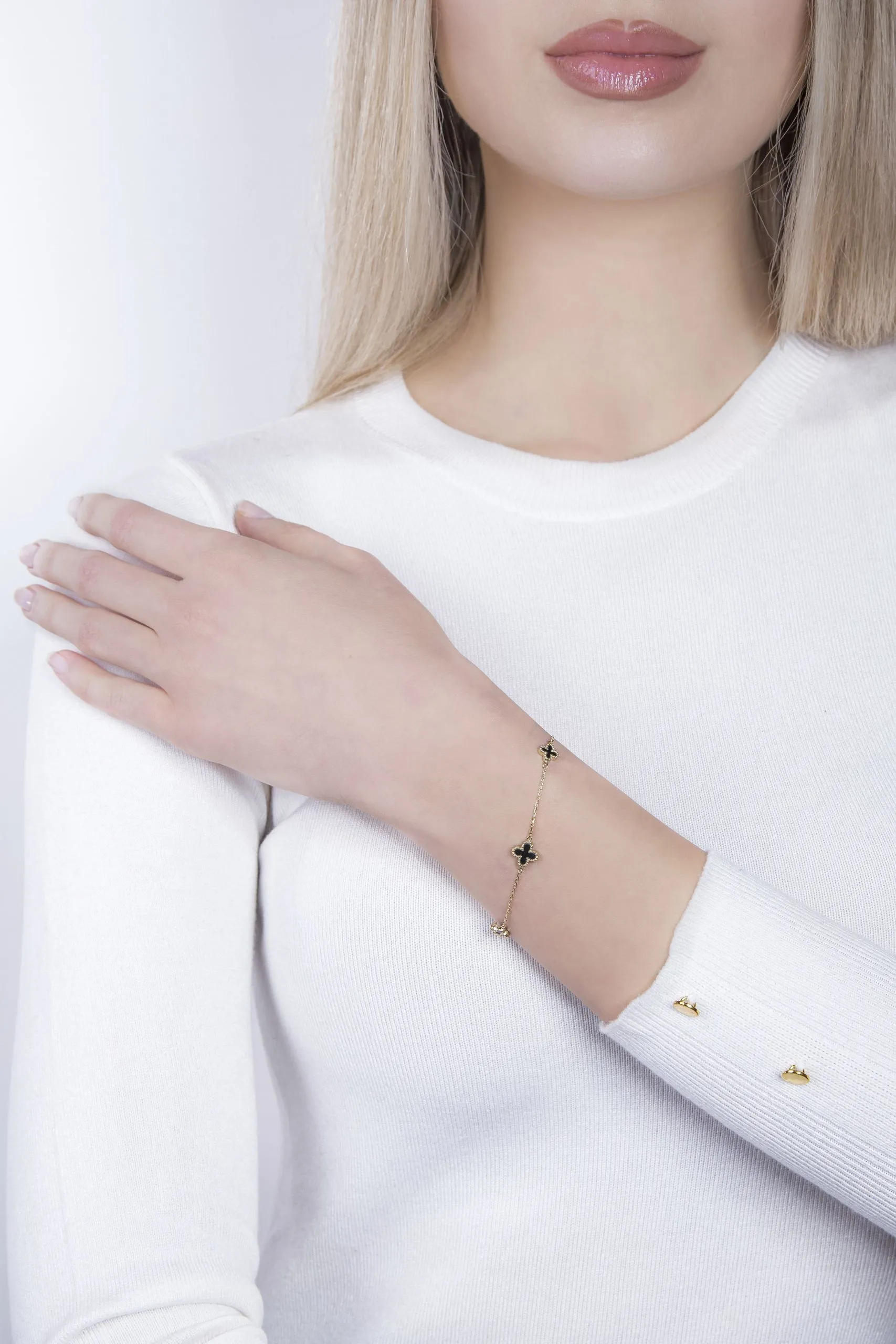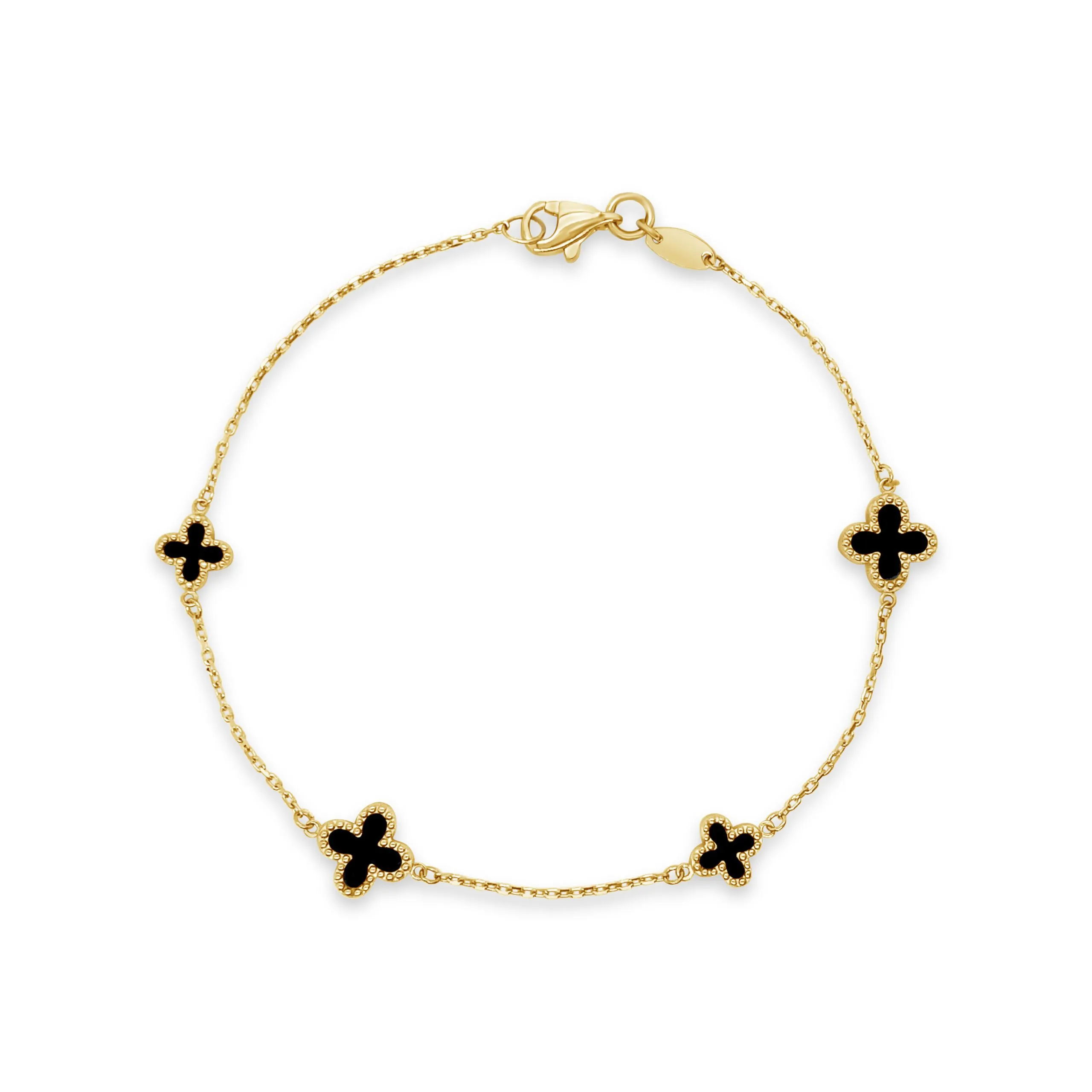 Four Clover narukvica idealan je poklon za posebne prilike u kojima želite poželjeti sreću Vama dragoj osobi. Jednostavna narukvica izrađena od 14 kt žutog zlata, ukrašena je s četiri privjeska u obliku djeteline s četiri lista. Privjesci su ispunjeni dragim kamenom onixom.