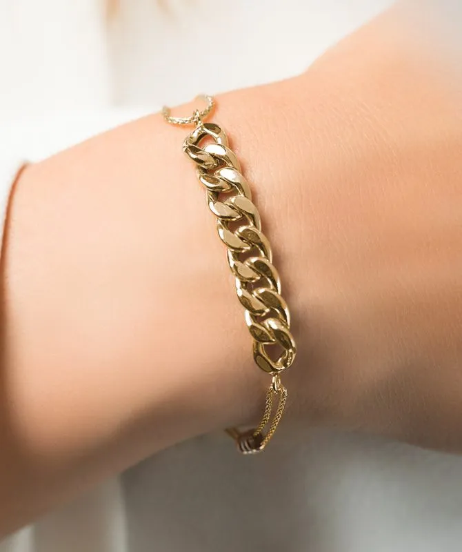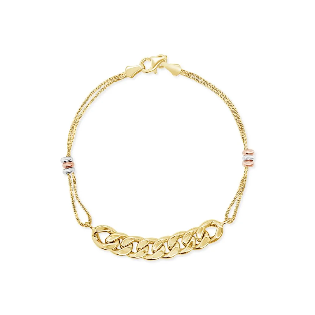 Gasp zlatna narukvica izrađena je od kombinacija 14 kt žutog i bijelog zlata, a dodatno je ukrašena modernim lancem umjesto privjeska. Kombinirajte je uz istoimenu ogrlicu. Duljina narukvice 19 cm, duljina motiva lanca 4,5 cm.