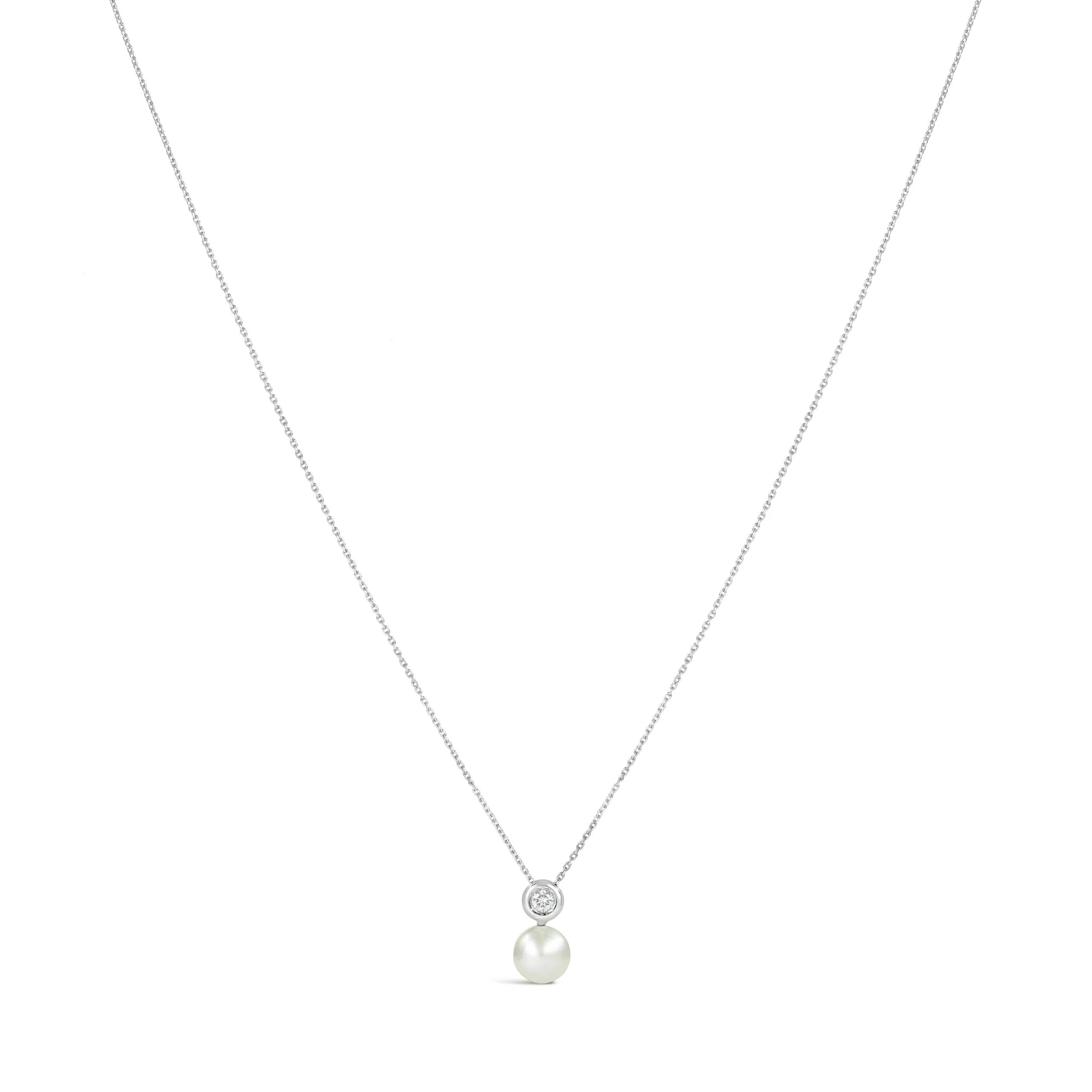 Ogrlica u 18-karatnom bijelom zlatu s biserom i dijamantom veličine 0,05 ct idealna je za one koji traže klasičan, ali luksuzan komad. Suptilni biser i dijamant stvaraju harmoniju elegancije.
