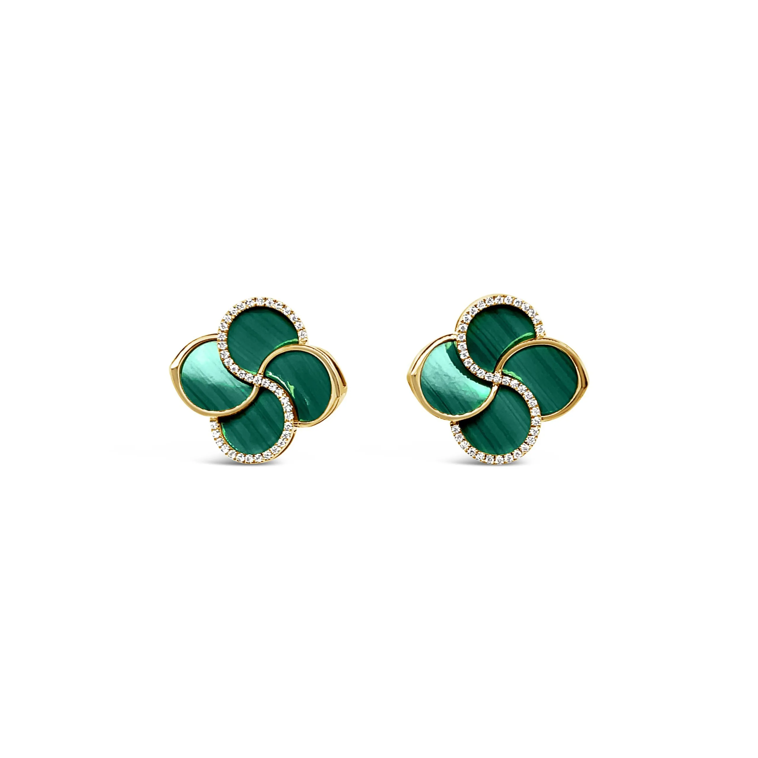 Pokažite ljubav i sreću Vašoj voljenoj osobi. Green Clovers naušnice izrađene od 18 kt žutog zlata idealne su za poklon. U obliku djeteline s četiri lista koji simbolizira sreću ispunjene dragim kamenom malahitom i ukrašene dijamantima.