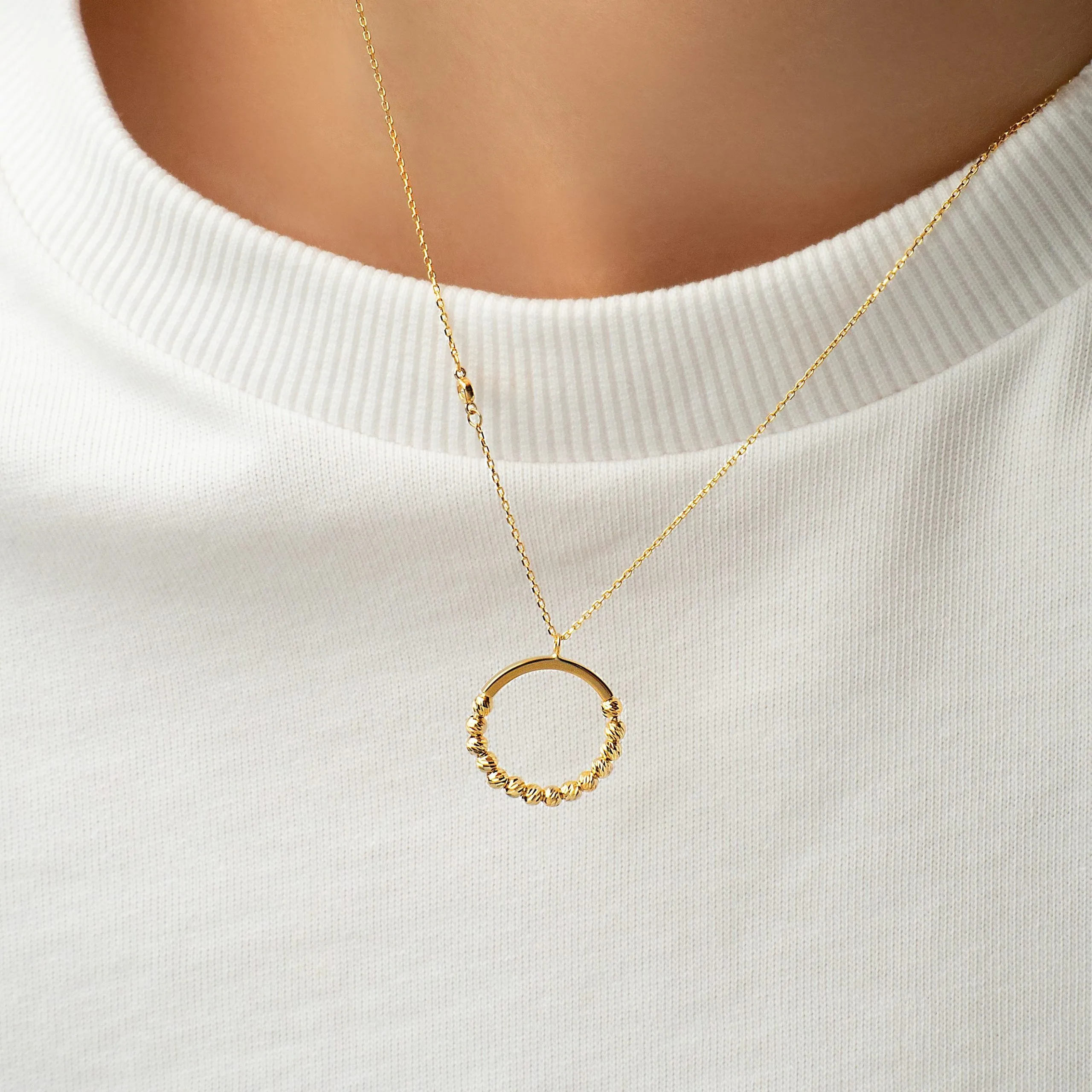 Halo zlatna ogrlica odašilje poruku privlačenja suprotnoti. Izrađena pažljivom kombinacijom poliranog zlata i u polukrugu nizanih kuglica spojenih u cjelinu, ova ogrlica stvara izražajan kontrast između klasične elegancije i suvremenog izraza. Izrađena je od visokokvalitetnog 14kt žutog zlata u dimenziji 43+2 cm. Širina privjeska je 1,5 cm.