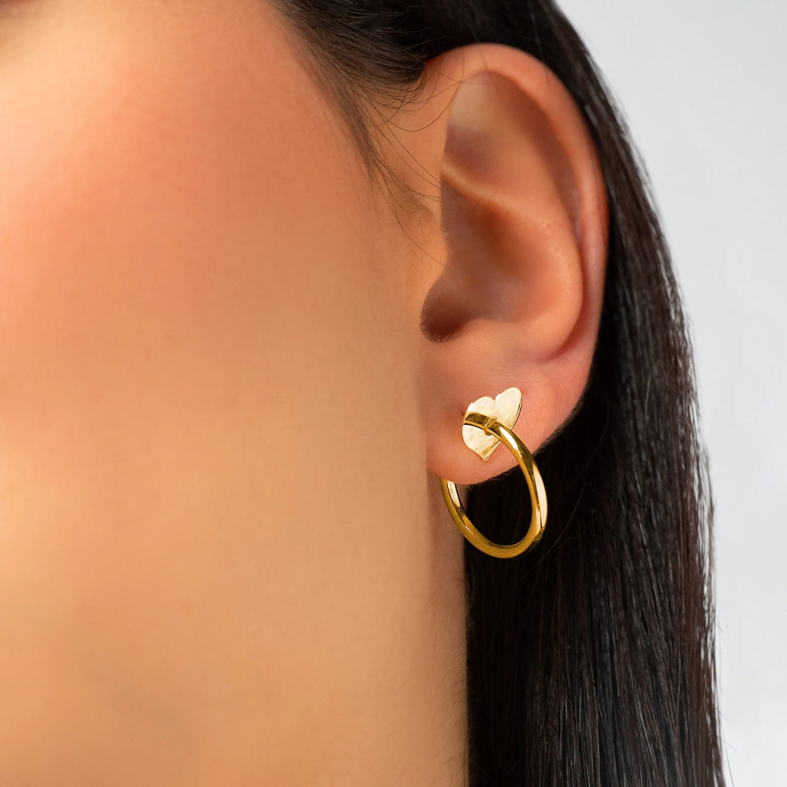 Heart Circles zlatne naušnice prekrasne su naušnice koje ističu eleganciju i nježnost svoje vjerne nositeljice. Nježan prekinut krug na samom početku nosi pločicu u obliku srca koja mu dodaje notu nježnosti. Heart Circles naušnice savršen su dar i za malene i velike dame. Heart Circles zlatne naušnice izrađene su od 14kt žutog zlata u dimenziji od 1,5 cm.