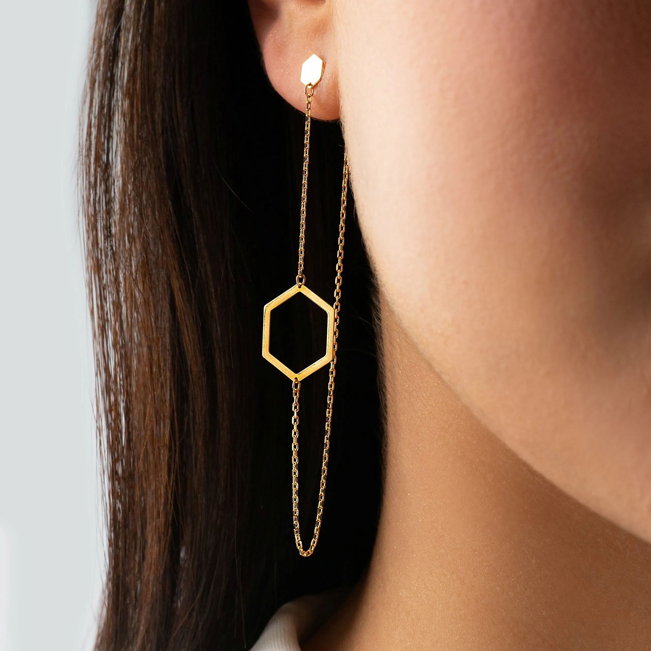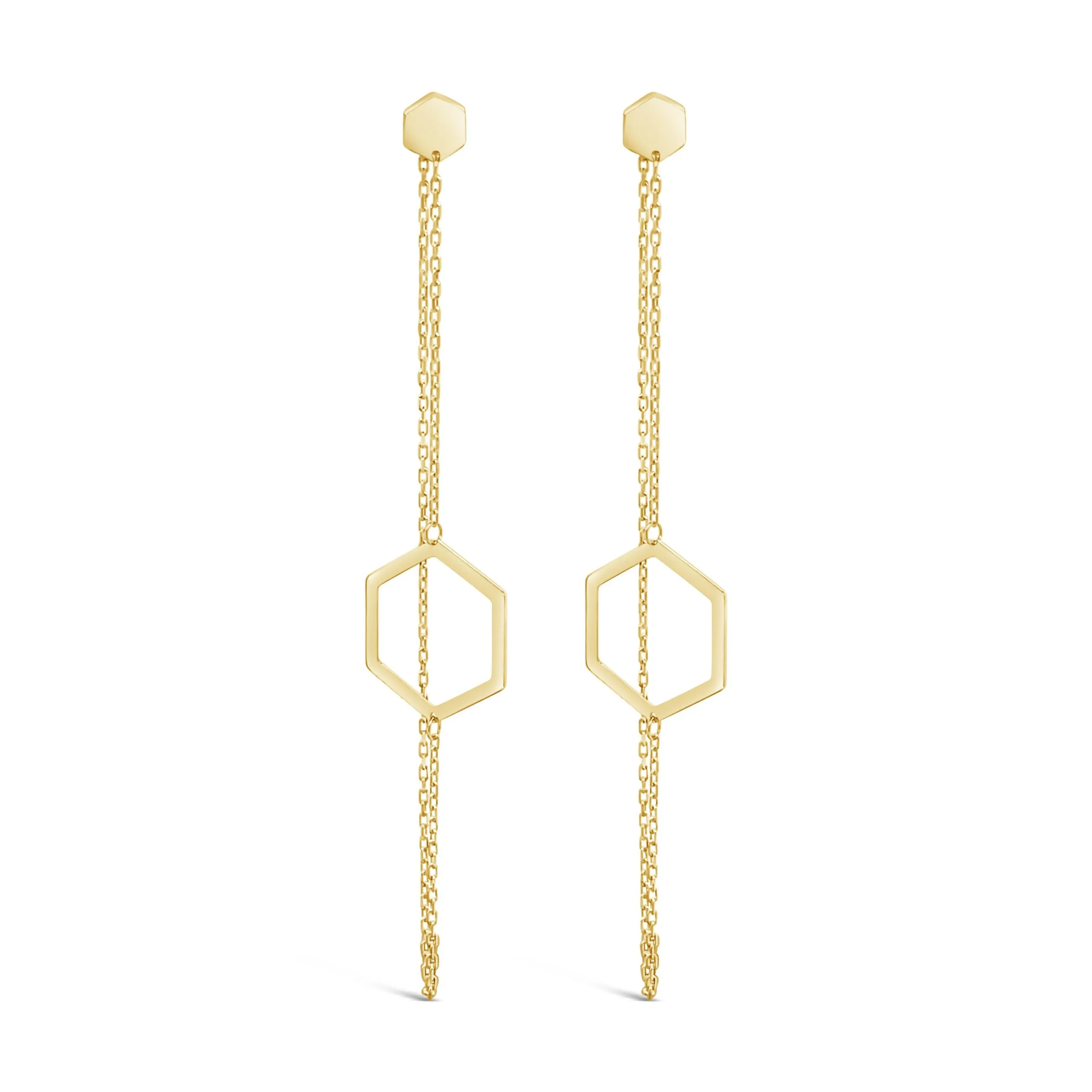 Moderan dizajn nalazi se u Hex Lines naušnicama od 14 kt žutog zlata. Radi se o visećim naušnicama ukrašene privjeskom u obliku heksagona koje će savršeno upotpuniti Vaše outfite.