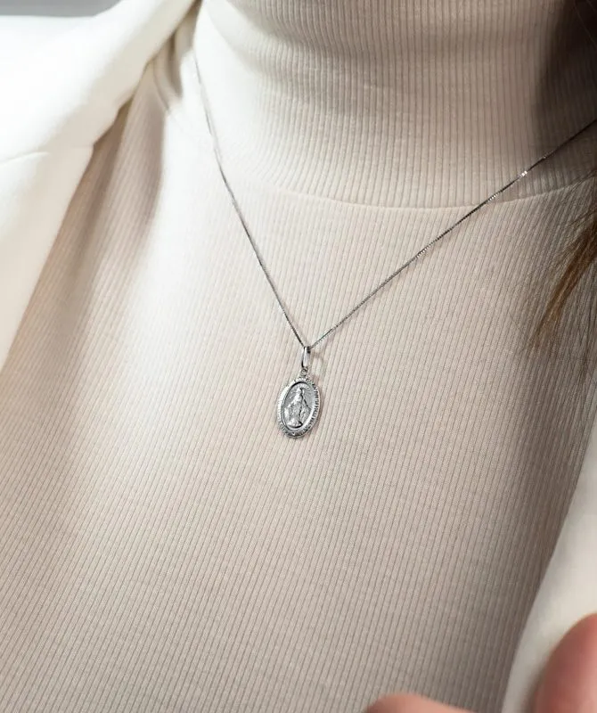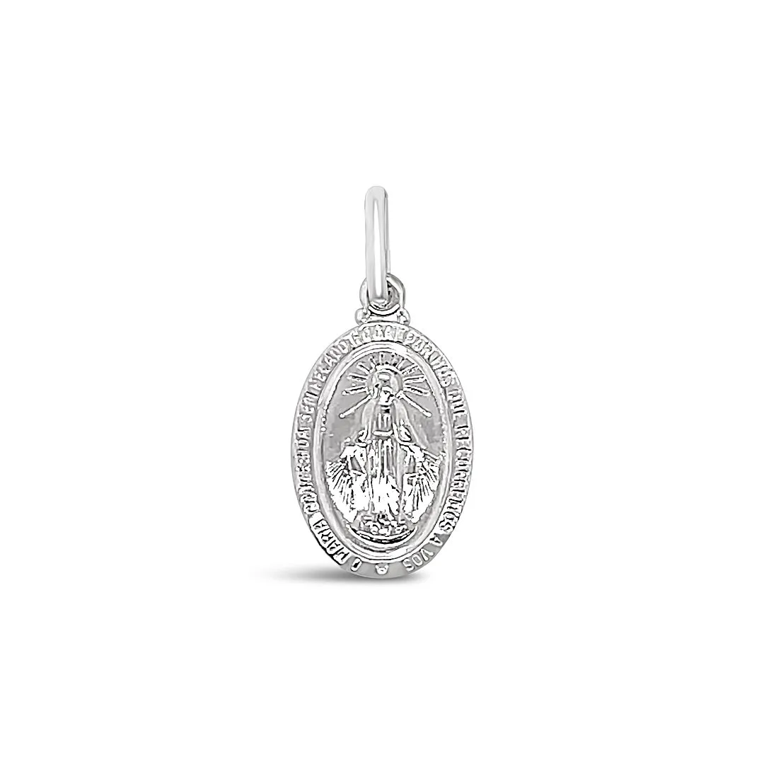 Holy Mary zlatni privjesak je izrađen od 14 kt bijelog zlata u obliku medaljona s likom Djevice Marije. Dimenzije privjeska su 2×1 cm, a odlično se kombinira uz Dodić zlatni lančić.