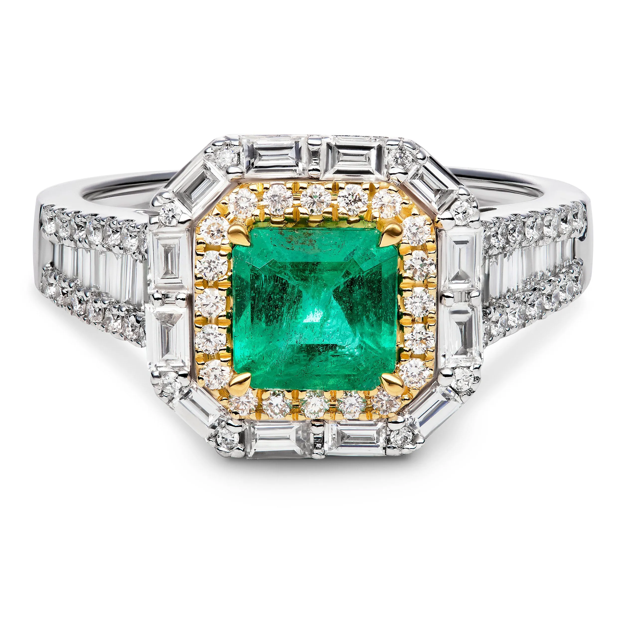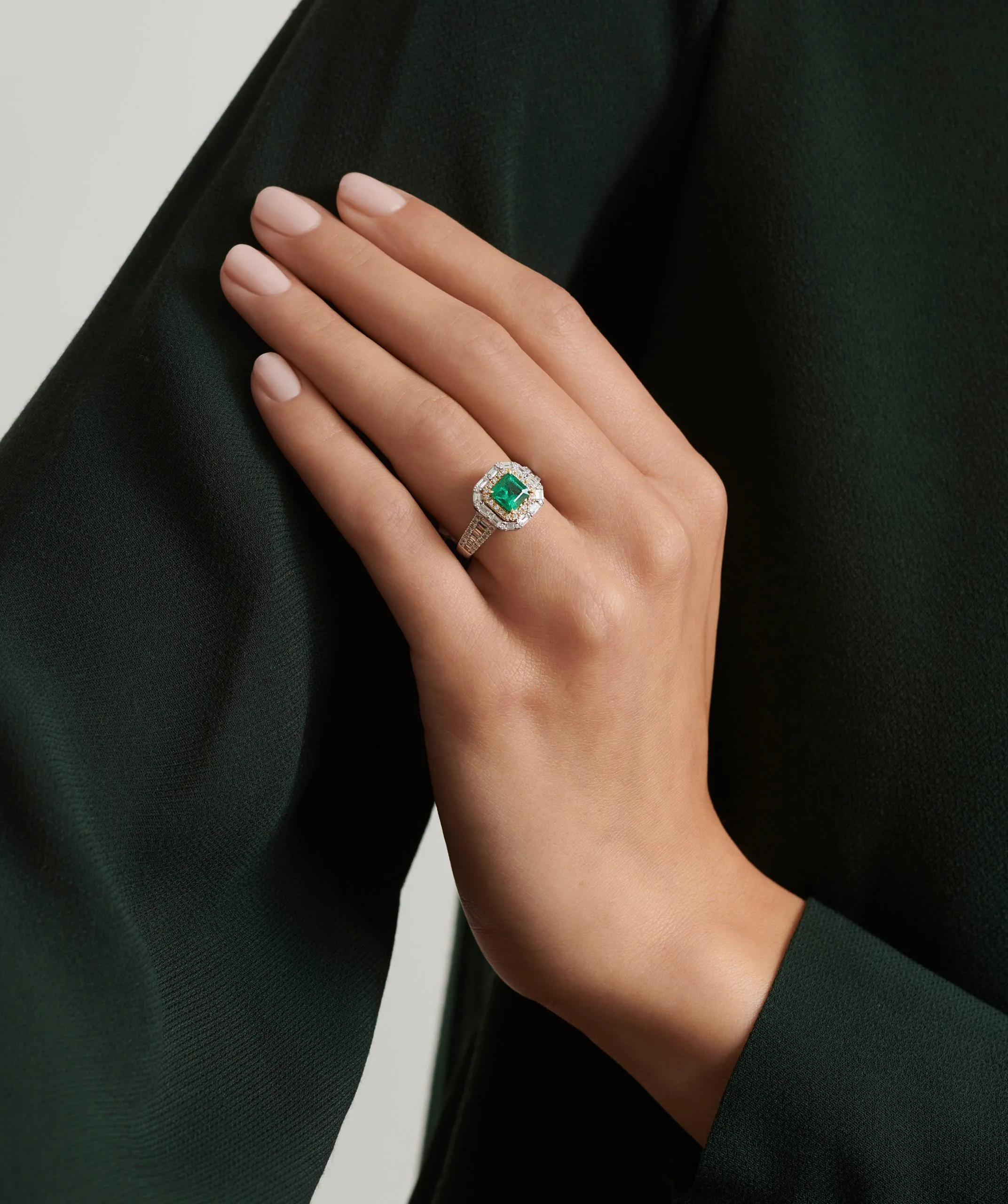 Imperial Eden prsten je izrađen od 18-karatnog bijelog zlata. Prsten krasi smaragd predivne zelene boje dok je ljepota ovog prstena dodatno naglašena dijamantima baguette i round oblika. Imperial Eden je savršen odabir za sve one koji vole bogatiji nakit jer ovaj prsten neće proći nezamijećeno.