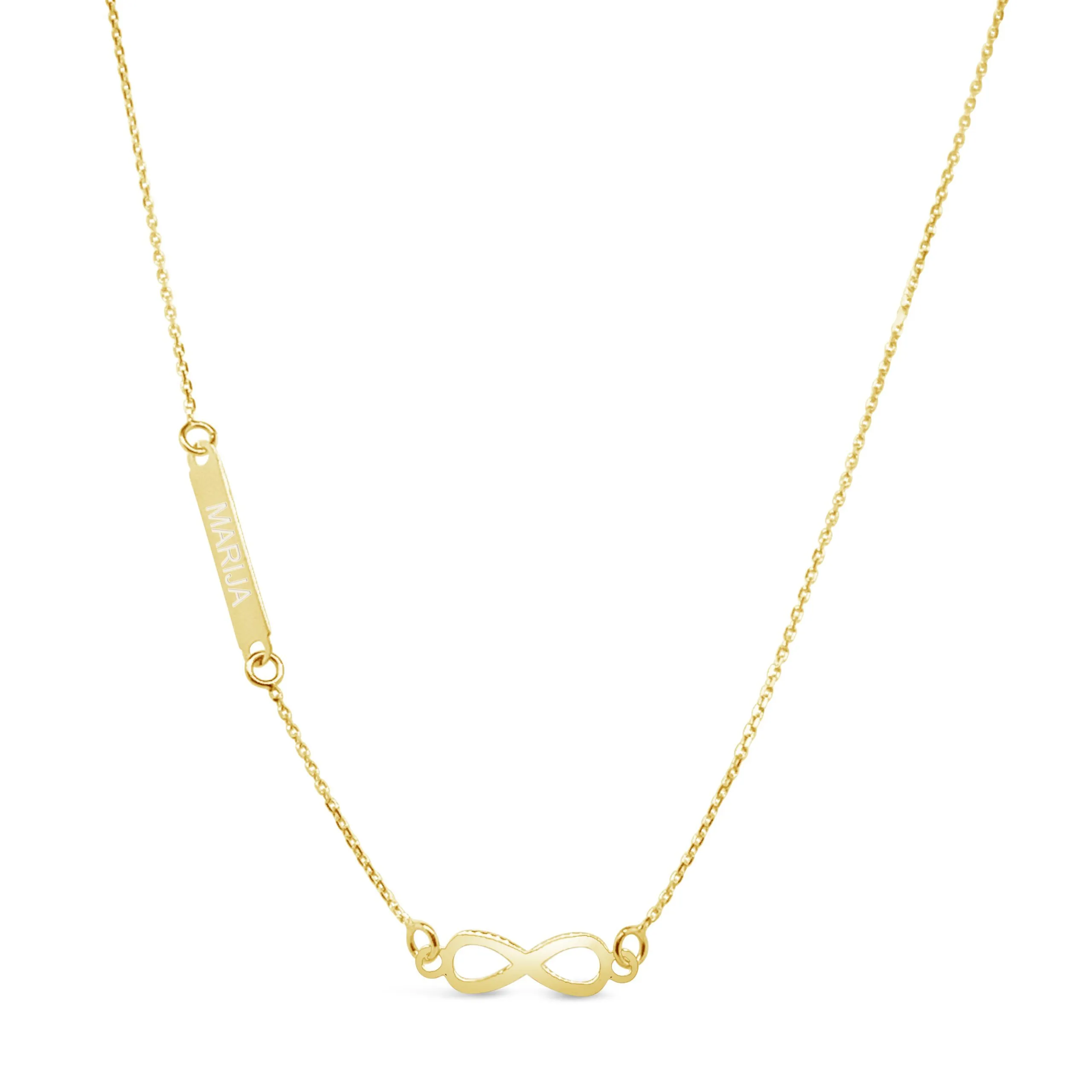 Dodajte bezvremenski nakit svojoj kolekciji i slavite vječnu ljubav. Ogrlica Infinity Tag izrađena od 14kt žutog zlata u dužini 42+3cm i s tvrdim privjeskom pogodnim za graviranje uz simbol beskonačnosti. Elegantna i posebna kao simbol beskonačnosti, idealan je odabir za poklon prijateljici, ženi ili djevojci.