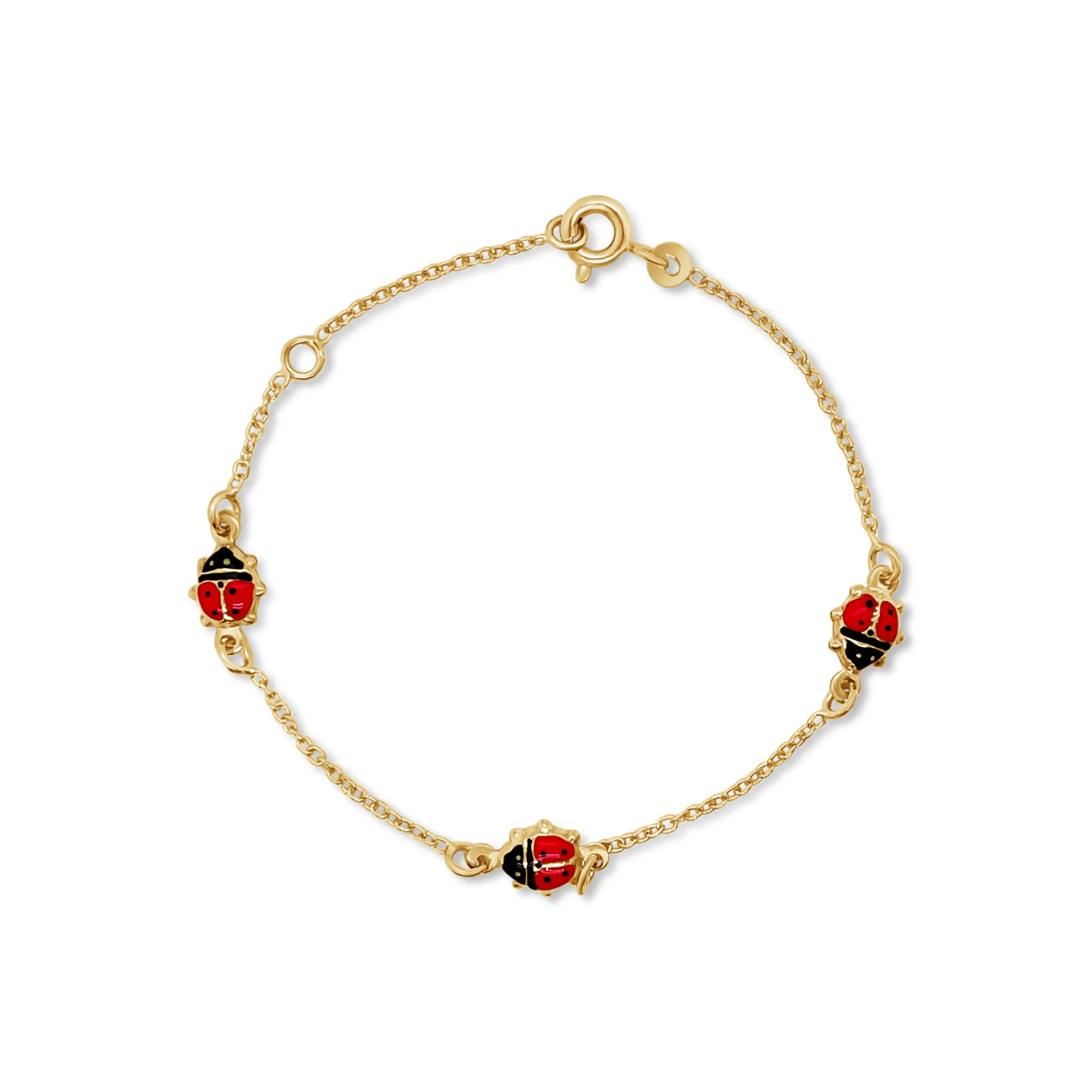 Ladybirds zlatna narukvica nježna je narukvica izrađena od 14 kt žutog zlata, a na nju su se spustile tri bubamare – za sreću.