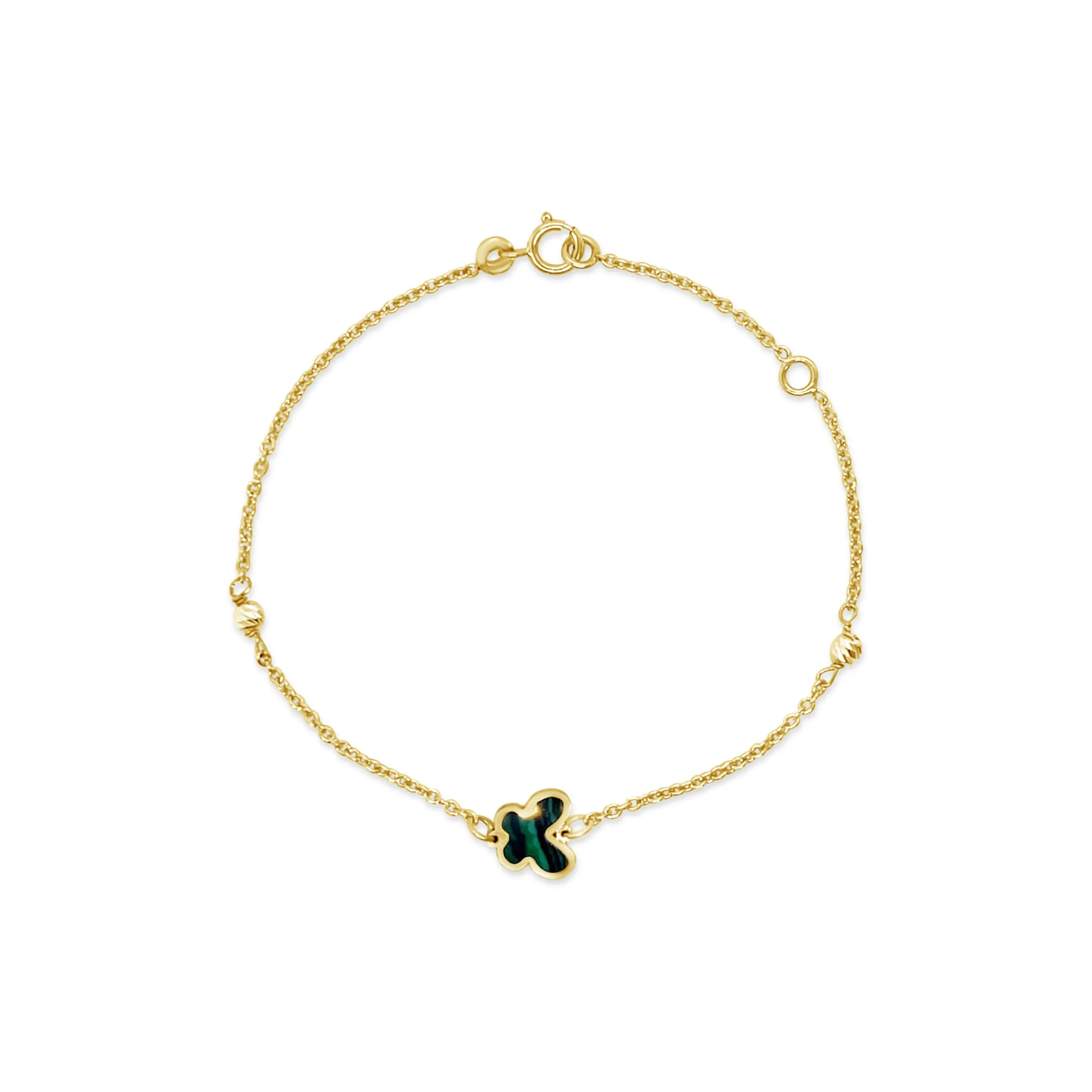 Mariposa zlatna narukvica s malahitom lijepa je narukvica izrađena od 14 kt žutog zlata, dodatno ukrašena leptirom od malahita.