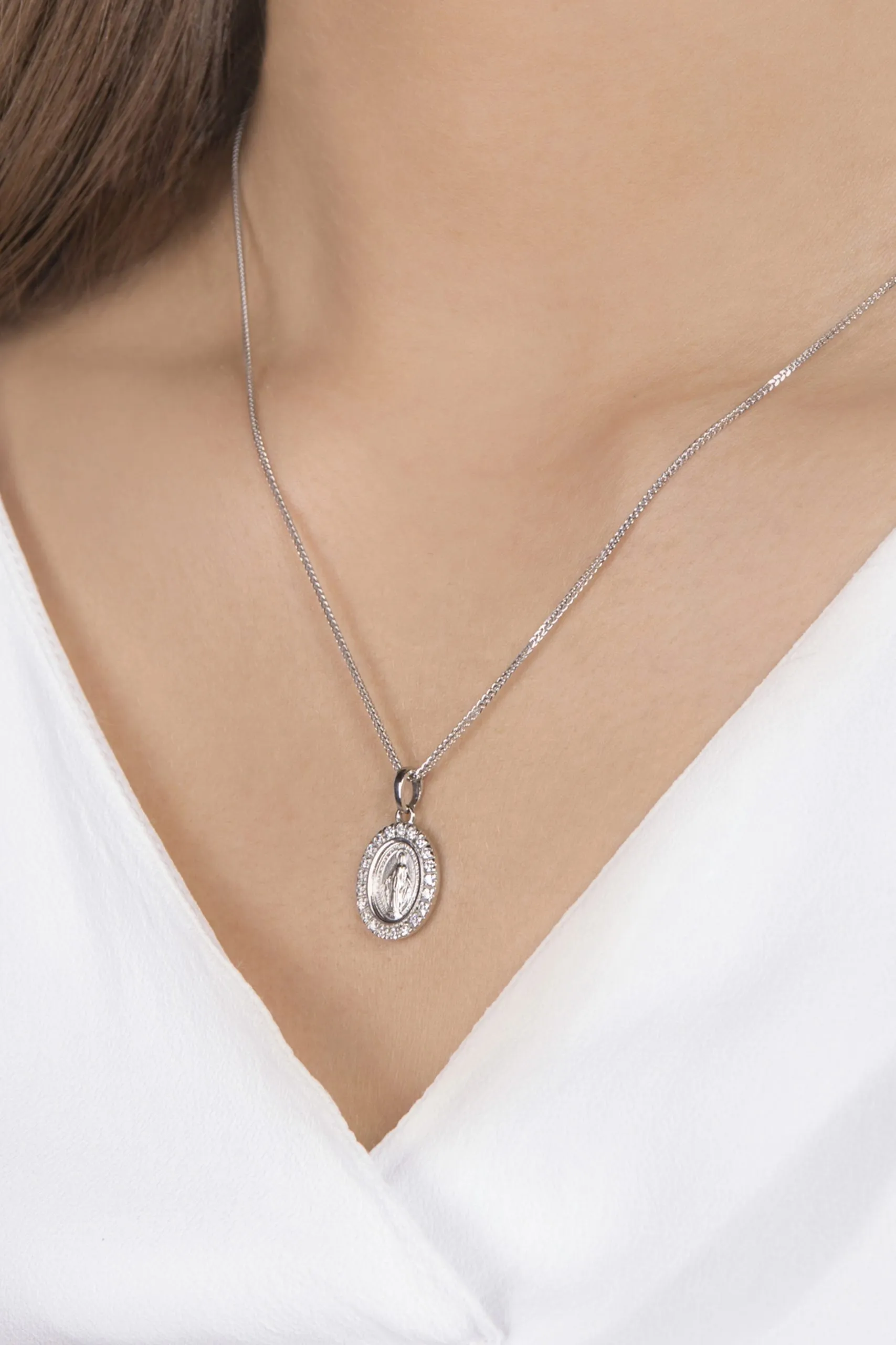 Privjesak ovalnog oblika s likom Blažene Marije izrađen od 14 kt bijelog zlata, ukrašen cirkonima. Može se nositi na bilo kojem lančiću. Istaknite svoju vjeru odabirom ovog privjeska. Naručite danas dostavu na kućnu adresu.