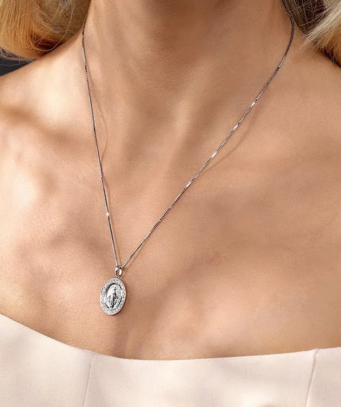 Zlatna ogrlica inspirirana motivom Gospe, u isto vrijeme decentna i glamurozna, postat će Vaš najdraži modni dodatak. Obrubljena sjajem sitnih dijamanata, dimenzija 0,23ct i teksture od 18kt bijelog zlata predstavlja bezvremenski klasik. Dostava na kućnu adresu.