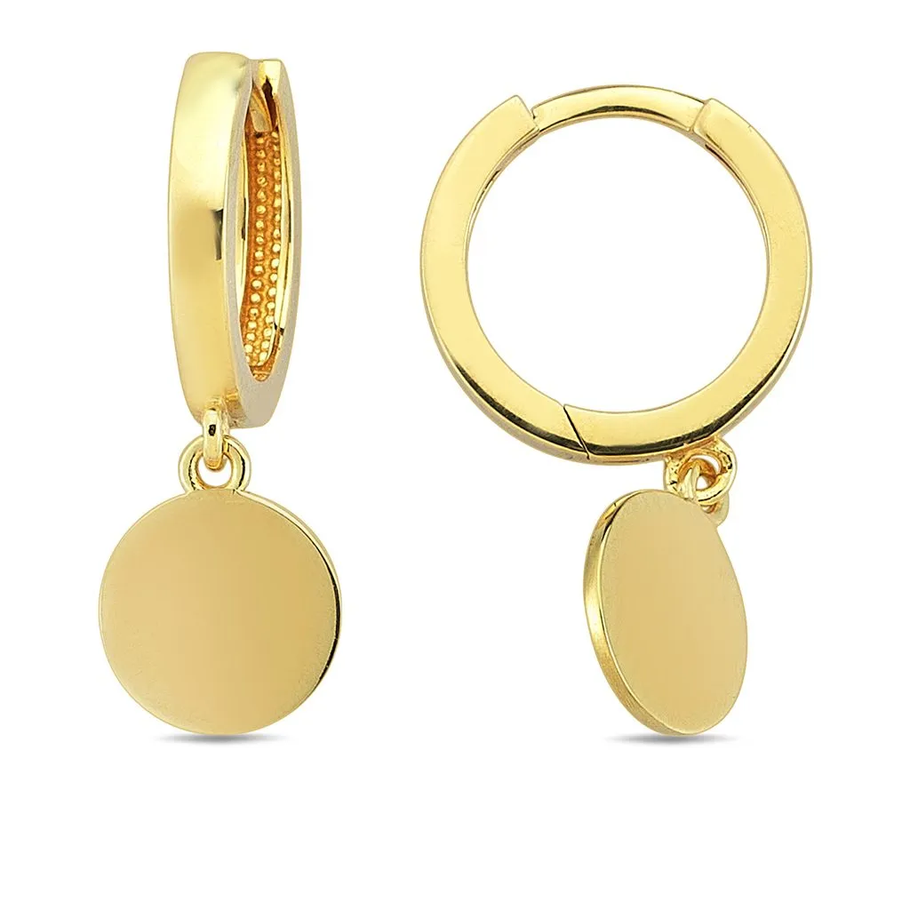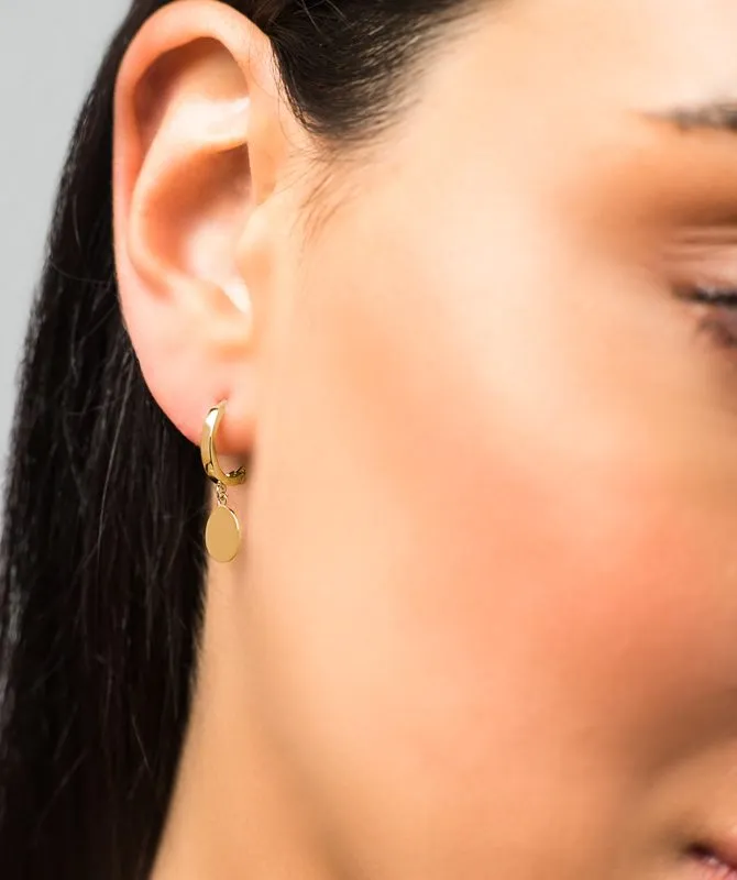 Plates zlatne naušnice izrađene su od 14 kt žutog zlata s privjeskom, na svakoj naušnici, u obliku okrugle pločice. Na privjesak možete dati ugravirati inicijal kao uspomenu. Zlatne naušnice su idealan poklon za Vama dragu osobu. Naručite brzo i sigurno na svoju adresu.