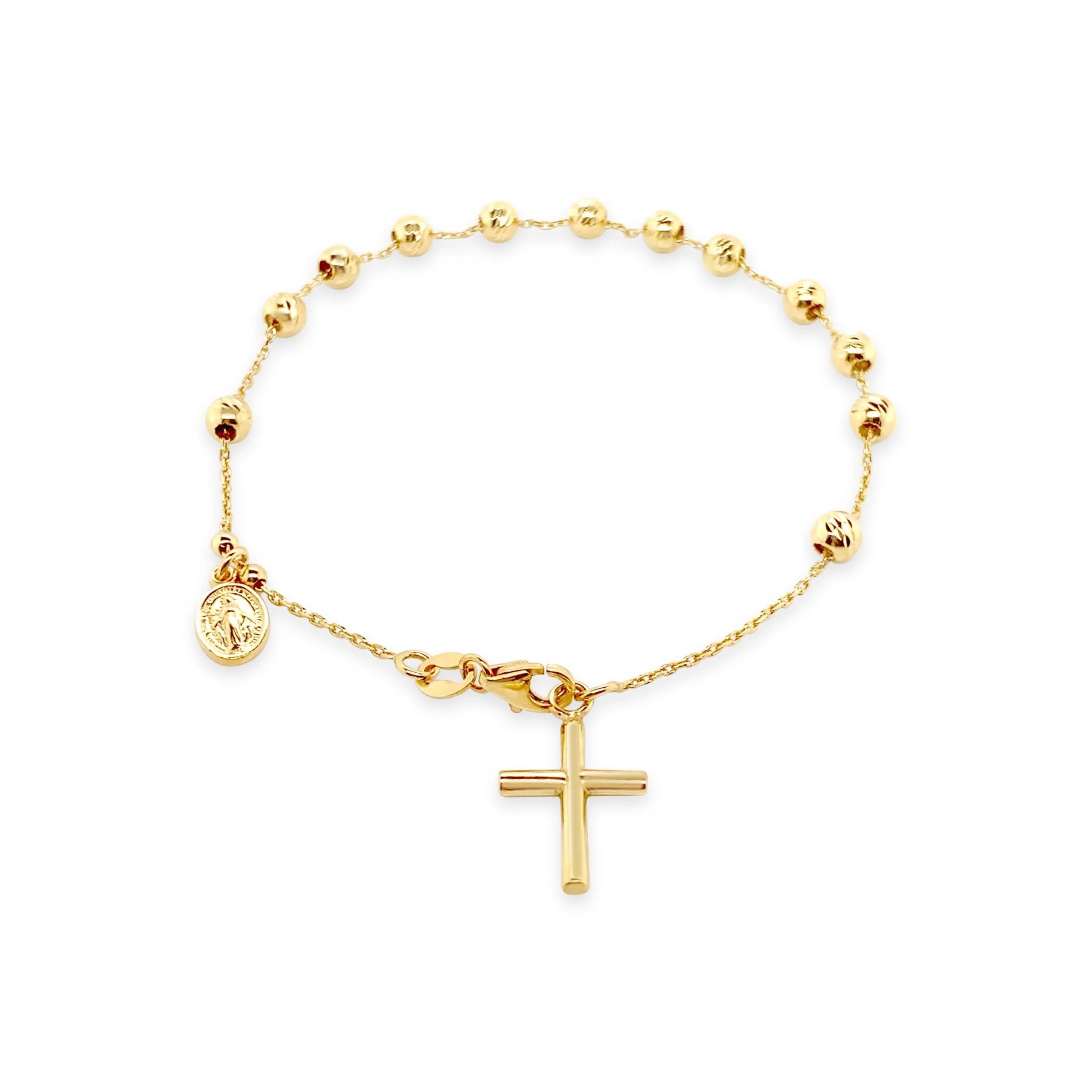 Predivna narukvica krunica izrađena od 14kt zlata savršeno opisuje Vašu pouzdanost i originalnost. Privjesak križa na kopči koji je dodatno oplemenjen crnim zlatom daje unikatnost a ručno izrađen decentni privjesak s likom Gospe omogućuje Vam kreiranje jedinstvenog stila. Dužina narukvice 21 cm.