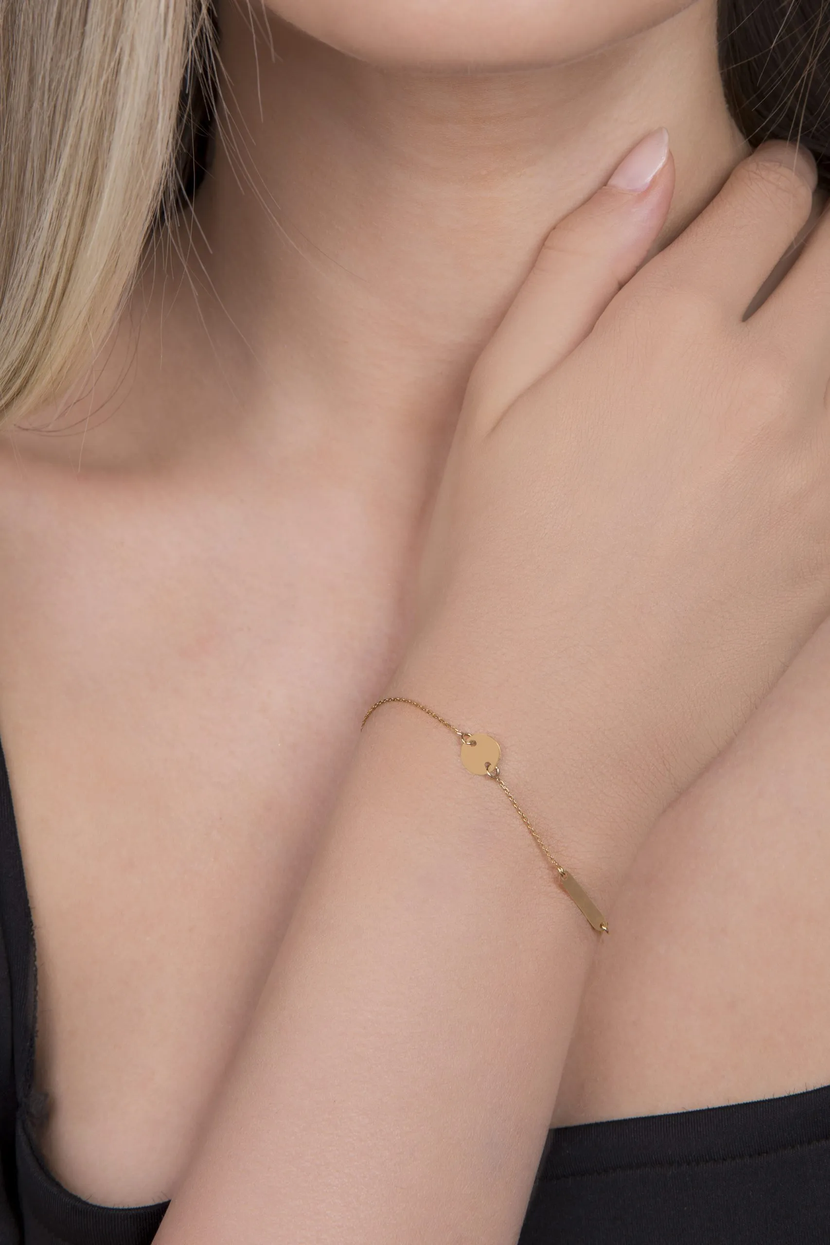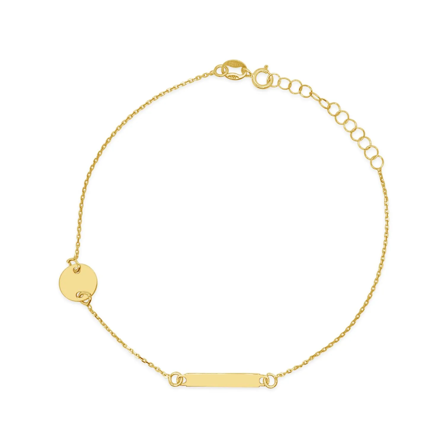 Narukvica od 14kt žutog zlata jedinstvenog dizajna savršen je izbor za svaki dan. Tvrdi privjesak na narukvici dužene 17+3cm idealan je za posebnu poruku Vama dragoj osobi koju će upotpuniti privjesak u obliku kruga. Ovaj sjajan nakit zasigurno je predivan poklon dragoj prijateljici, majci ili sestri.