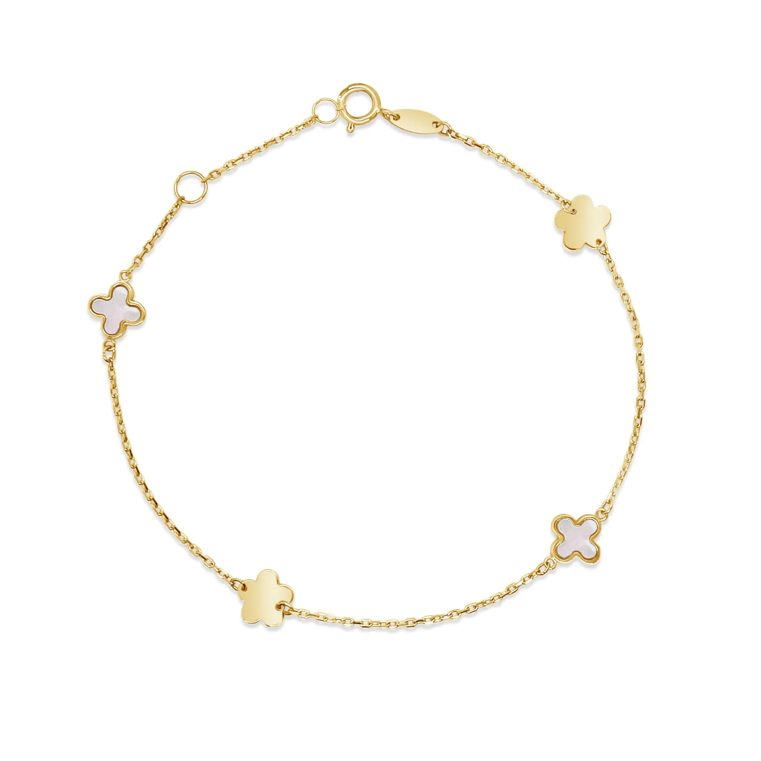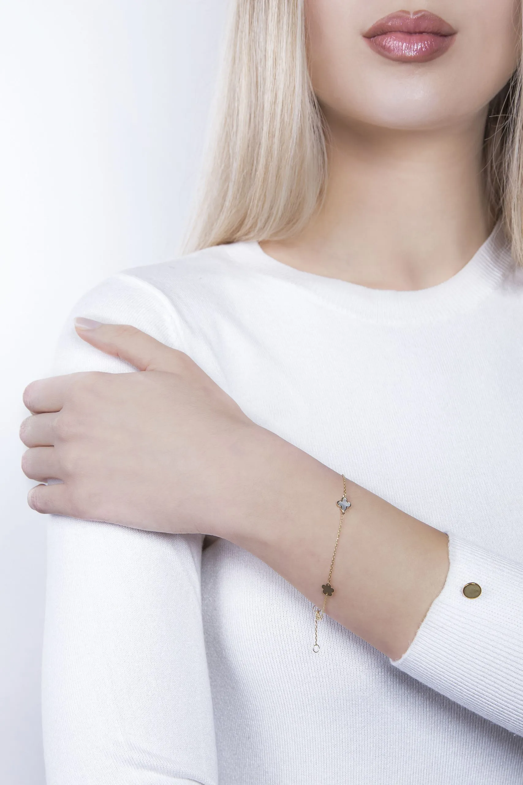 Secret Garden narukvica idealan je poklon za posebne prilike u kojima želite poželjeti sreću Vama dragoj osobi. Jednostavna narukvica izrađena od 14 kt žutog zlata, ukrašena je s četiri privjeska u obliku djeteline s četiri lista. Privjesci su ispunjeni blještavim sedefom.