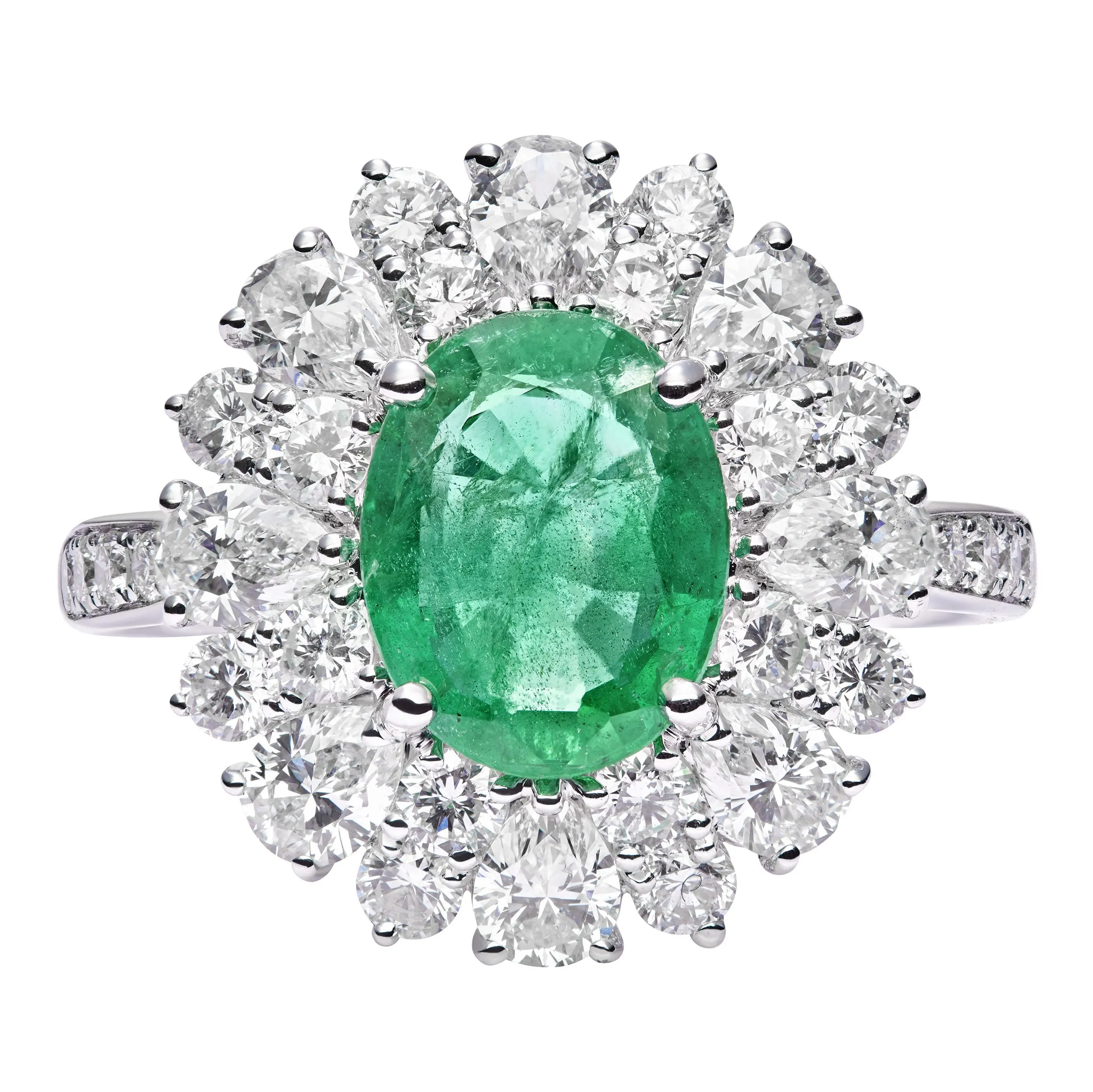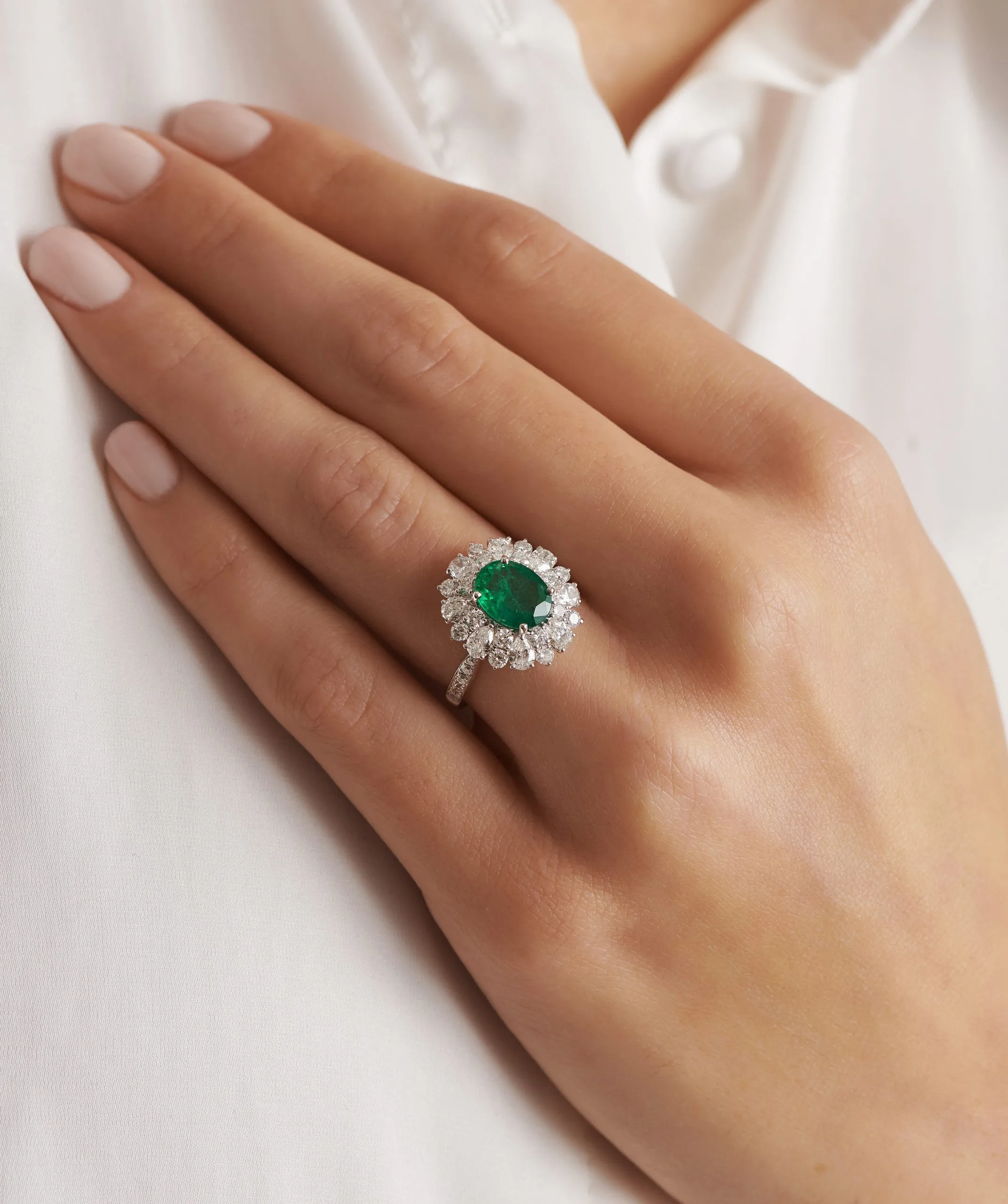 Smaragd Elegance zlatni prsten sa smaragdom i dijamantima u obliku cvijeta, izrađen od bijelog zlata, prava je definicija elegancije. Središnji smaragd savršeno je okružen blistavim dijamantima, stvarajući očaravajući vizualni dojam. Floralni dizajn prstena dodaje mu nježnu, ali luksuznu notu, čineći ga idealnim izborom za posebne trenutke. Ovaj prsten simbolizira ljepotu i romantiku, a svojom izradom i jedinstvenim dizajnom zasigurno će vas očarati.