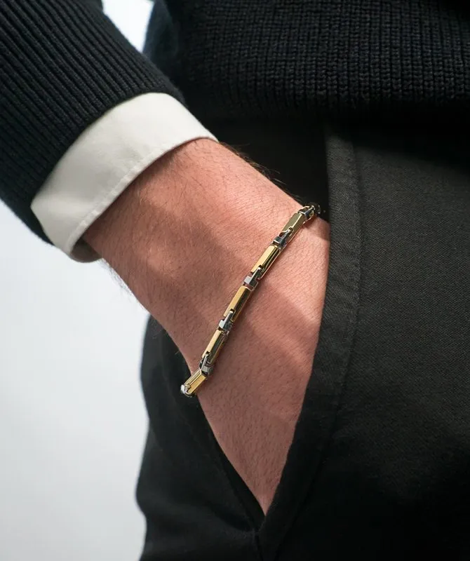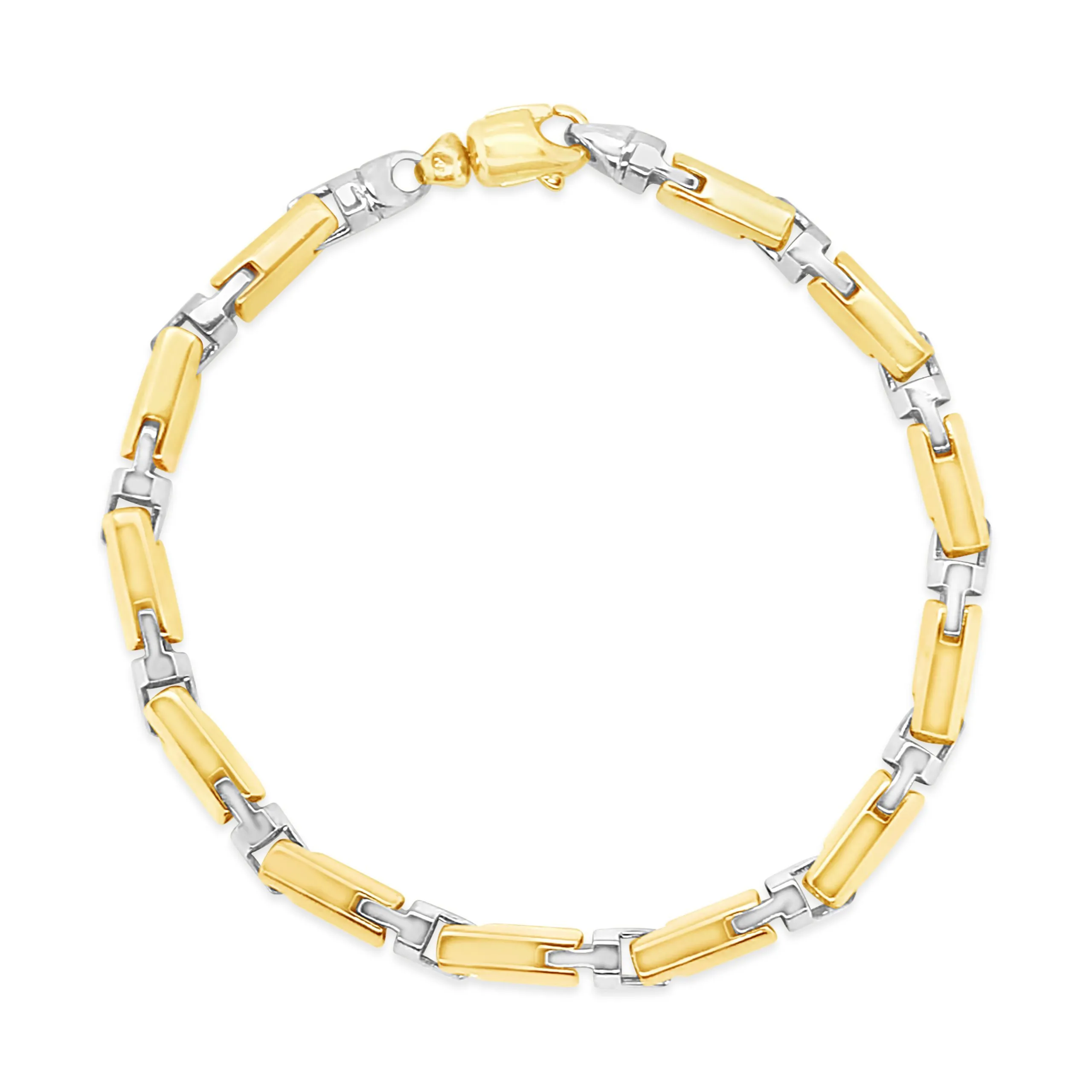 Jednostavan dizajn narukvice izrađene od 14 kt žutog zlata, ukrašene spojevima od bijelog zlata. Dužine 22 cm i 4,5 mm širine. Svidjet će se svakom muškarcu. Naručite dostavu na kućnu adresu.