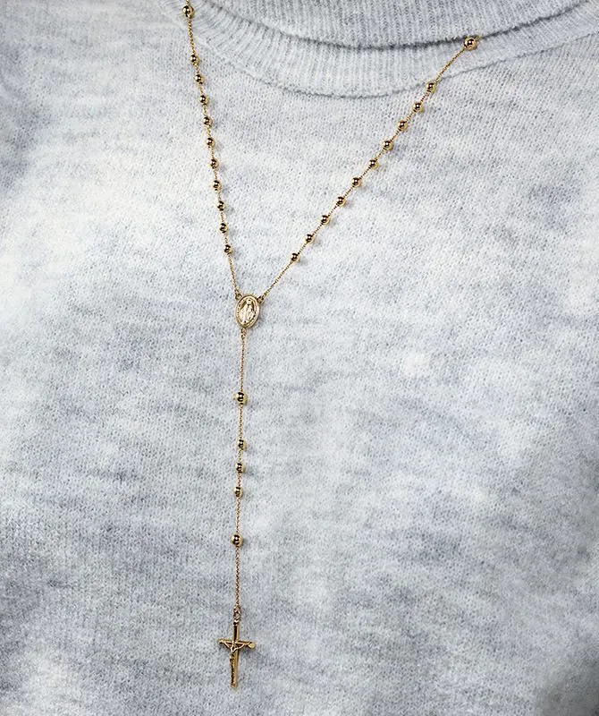 Vjerska tematika ispričana na moderan način. Zlatna ogrlica od 14kt žutog zlata satkana od okruglih kuglica u nizu, okrunjena motivom križa. Središnji sveti medaljon. Motiv krunice. Dimenzija 64cm.