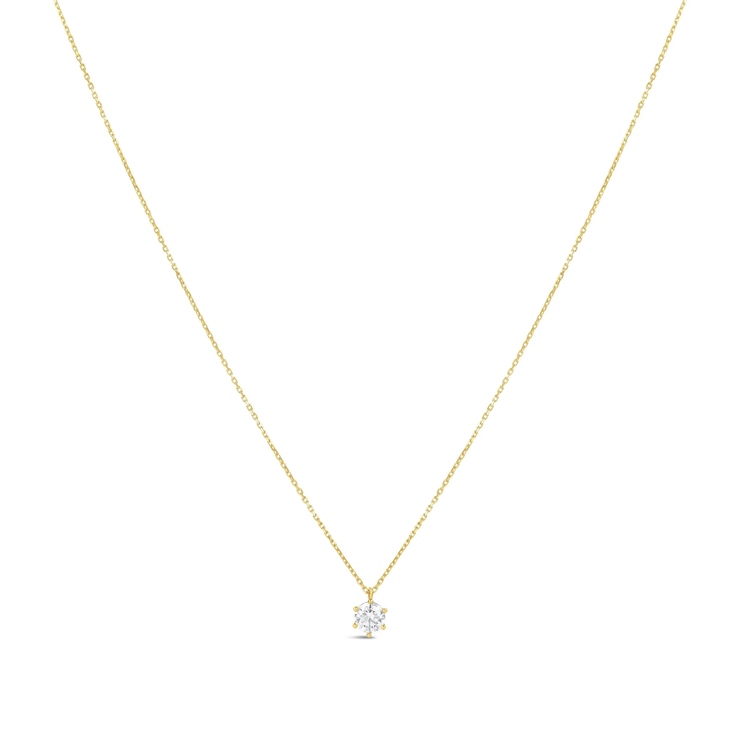 Zlatna ogrlica od 14-karatnog zlata s jednim svjetlucavim kamenčićem stvara nježan sjaj koji zrači kroz cijeli dan. Savršen poklon za one koji žele nositi eleganciju u jednostavnom, ali luksuznom obliku.