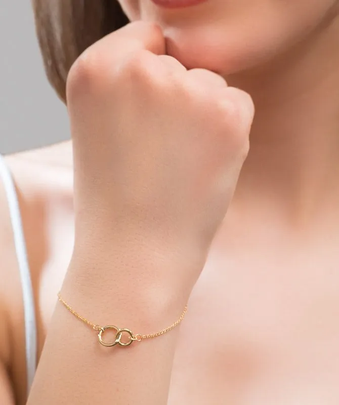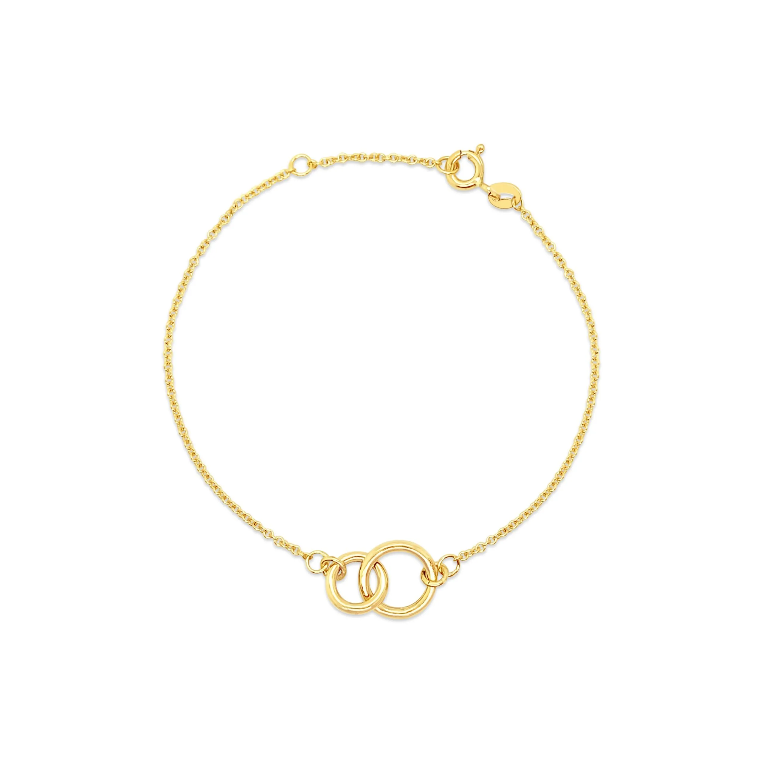 Jednostavan dizajn narukvice izrađen od niza sitnih okruglih karika. 14 kt žuto zlato. Together narukvica ukrašena je s dva isprepletena privjesa u obliku kruga koji zajedno čine jedinstvo.