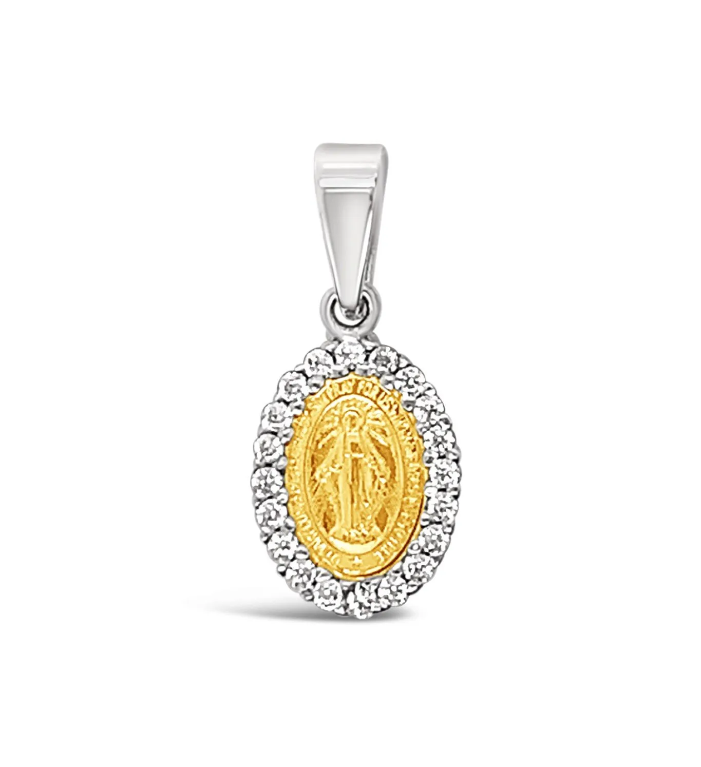 Privjesak ovalnog oblika s likom Blažene Marije izrađen od 14 kt žutog zlata, ukrašen cirkonima. Može se nositi na bilo kojem lančiću. Istaknite svoju vjeru odabirom ovog privjeska. Naručite danas dostavu na kućnu adresu.