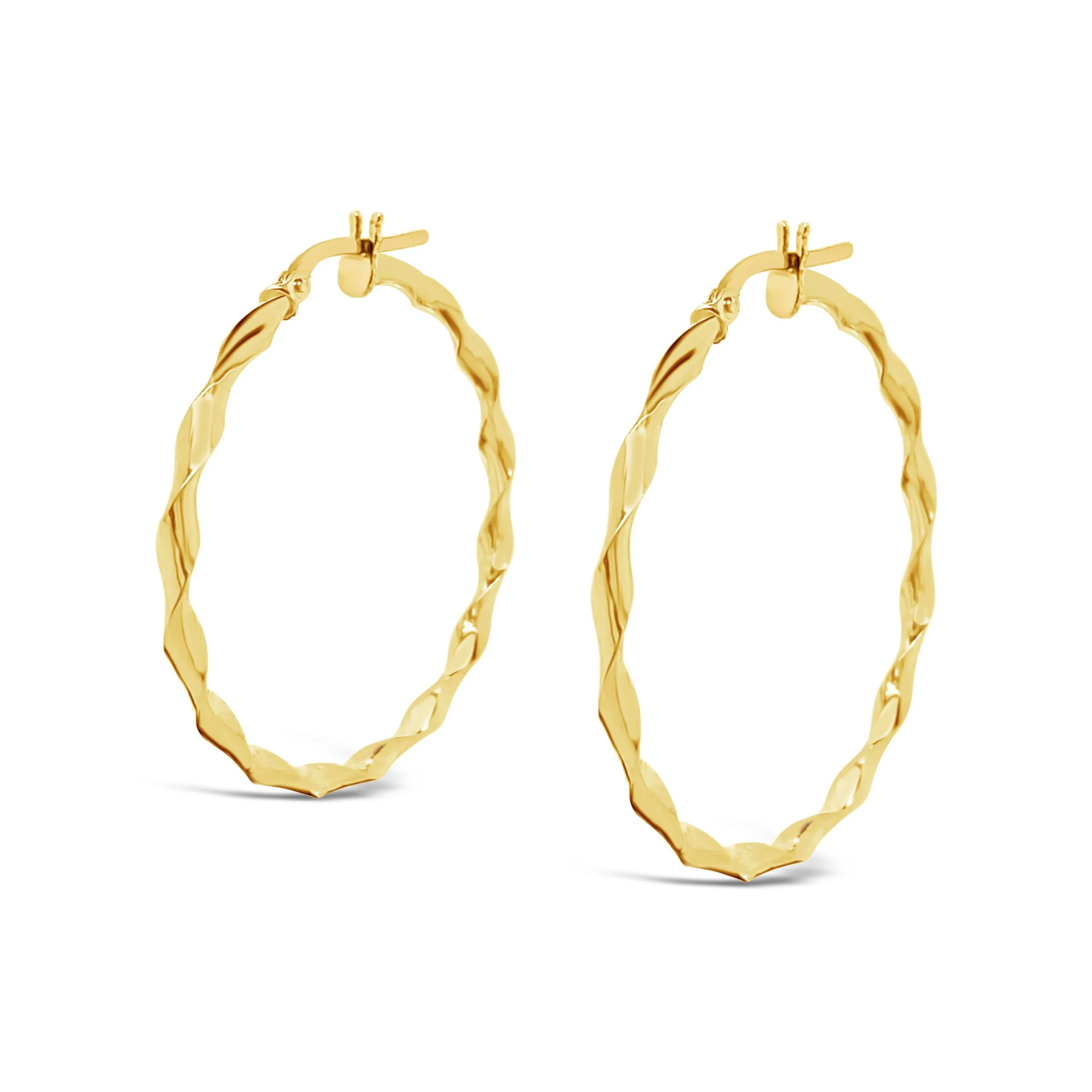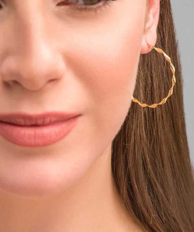 Waves zlatne naušnice asociraju na tople zrake sunca protkane u valovima. Izrađene su od 14 kt žutog zlata. Okrugli dizajn promjera 4 cm.